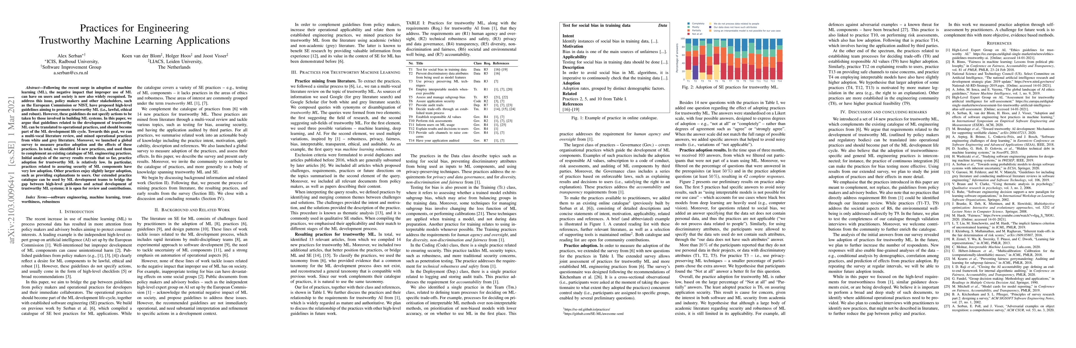 This paper identifies 14 new practices for building trustworthy machine learning applications and finds that adoption is relatively low, particularly in security practices.