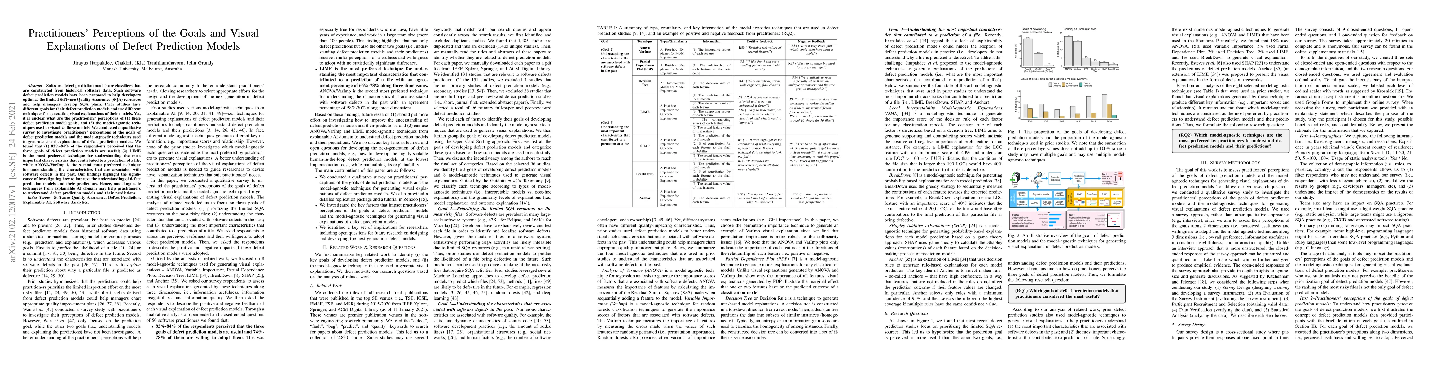 Software defect prediction models are classifiers that are constructed from historical software data. Such software defect prediction models have been proposed to help developers optimize the limited Software Quality Assurance (SQA) resources and help managers develop SQA plans. Prior studies have different goals for their defect prediction models and use different techniques for generating visual explanations of their models. Yet, it is unclear what are the practitioners' perceptions of (1) these defect prediction model goals, and (2) the model-agnostic techniques used to visualize these models. We conducted a qualitative survey to investigate practitioners' perceptions of the goals of defect prediction models and the model-agnostic techniques used to generate visual explanations of defect prediction models. We found that (1) 82%-84% of the respondents perceived that the three goals of defect prediction models are useful; (2) LIME is the most preferred technique for understanding the most important characteristics that contributed to a prediction of a file, while ANOVA/VarImp is the second most preferred technique for understanding the characteristics that are associated with software defects in the past. Our findings highlight the significance of investigating how to improve the understanding of defect prediction models and their predictions. Hence, model-agnostic techniques from explainable AI domain may help practitioners to understand defect prediction models and their predictions.