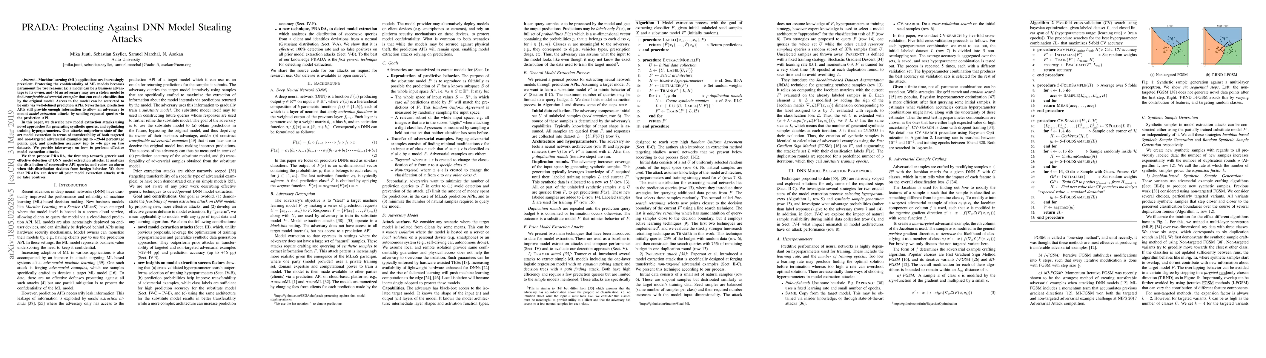 Machine learning (ML) applications are increasingly prevalent. Protecting the confidentiality of ML models becomes paramount for two reasons: (a) a model can be a business advantage to its owner, and (b) an adversary may use a stolen model to find transferable adversarial examples that can evade classification by the original model. Access to the model can be restricted to be only via well-defined prediction APIs. Nevertheless, prediction APIs still provide enough information to allow an adversary to mount model extraction attacks by sending repeated queries via the prediction API. In this paper, we describe new model extraction attacks using novel approaches for generating synthetic queries, and optimizing training hyperparameters. Our attacks outperform state-of-the-art model extraction in terms of transferability of both targeted and non-targeted adversarial examples (up to +29-44 percentage points, pp), and prediction accuracy (up to +46 pp) on two datasets. We provide take-aways on how to perform effective model extraction attacks. We then propose PRADA, the first step towards generic and effective detection of DNN model extraction attacks. It analyzes the distribution of consecutive API queries and raises an alarm when this distribution deviates from benign behavior. We show that PRADA can detect all prior model extraction attacks with no false positives.