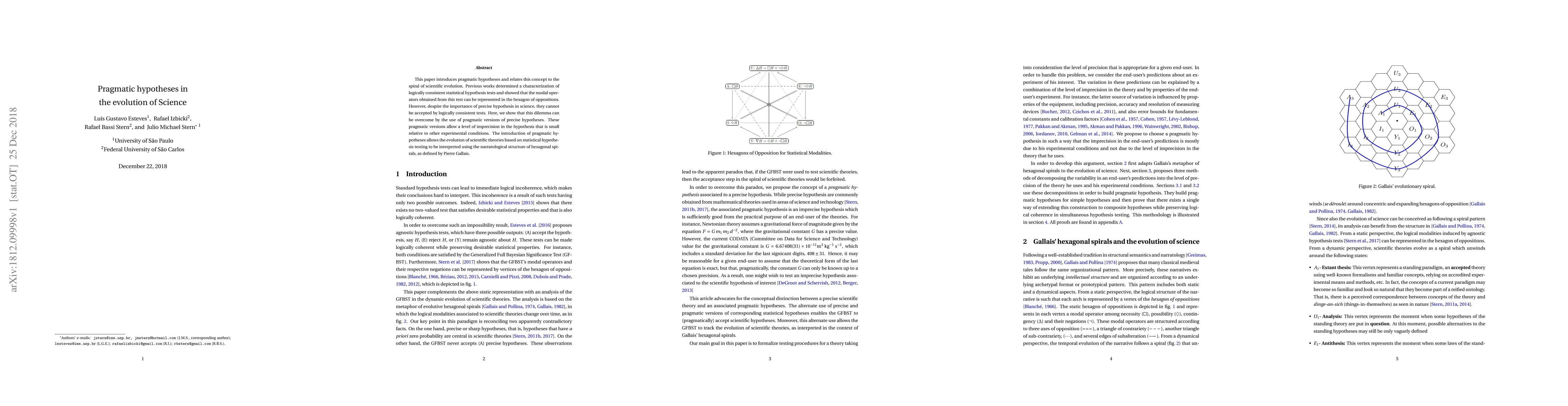 This paper introduces pragmatic hypotheses and relates this concept to the spiral of scientific evolution. Previous works determined a characterization of logically consistent statistical hypothesis tests and showed that the modal operators obtained from this test can be represented in the hexagon of oppositions. However, despite the importance of precise hypothesis in science, they cannot be accepted by logically consistent tests. Here, we show that this dilemma can be overcome by the use of pragmatic versions of precise hypotheses. These pragmatic versions allow a level of imprecision in the hypothesis that is small relative to other experimental conditions. The introduction of pragmatic hypotheses allows the evolution of scientific theories based on statistical hypothesis testing to be interpreted using the narratological structure of hexagonal spirals, as defined by Pierre Gallais.