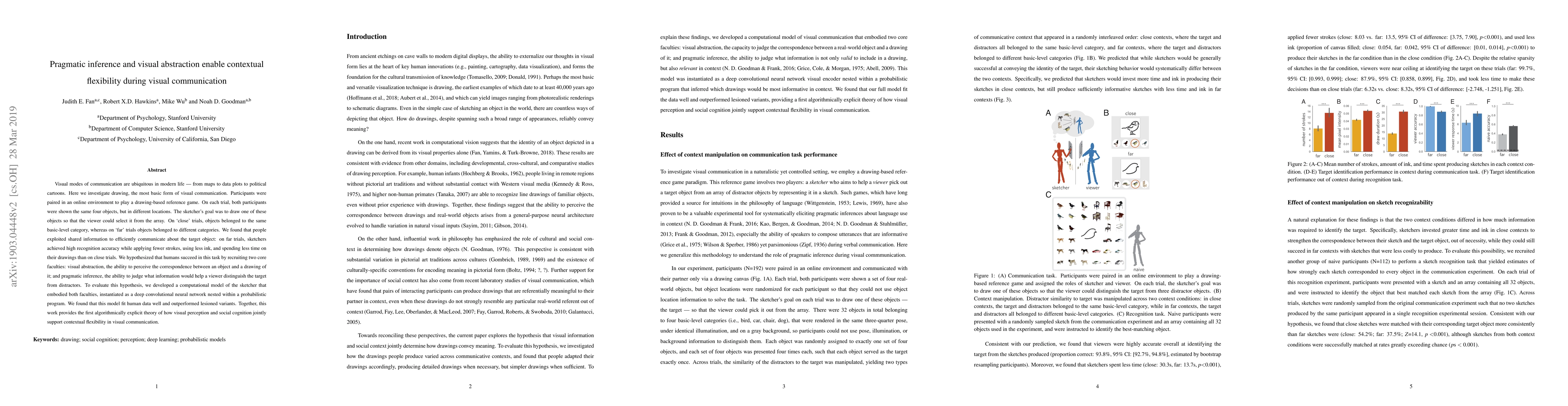 Visual modes of communication are ubiquitous in modern life --- from maps to data plots to political cartoons. Here we investigate drawing, the most basic form of visual communication. Participants were paired in an online environment to play a drawing-based reference game. On each trial, both participants were shown the same four objects, but in different locations. The sketcher's goal was to draw one of these objects so that the viewer could select it from the array. On `close' trials, objects belonged to the same basic-level category, whereas on `far' trials objects belonged to different categories. We found that people exploited shared information to efficiently communicate about the target object: on far trials, sketchers achieved high recognition accuracy while applying fewer strokes, using less ink, and spending less time on their drawings than on close trials. We hypothesized that humans succeed in this task by recruiting two core faculties: visual abstraction, the ability to perceive the correspondence between an object and a drawing of it; and pragmatic inference, the ability to judge what information would help a viewer distinguish the target from distractors. To evaluate this hypothesis, we developed a computational model of the sketcher that embodied both faculties, instantiated as a deep convolutional neural network nested within a probabilistic program. We found that this model fit human data well and outperformed lesioned variants. Together, this work provides the first algorithmically explicit theory of how visual perception and social cognition jointly support contextual flexibility in visual communication.
