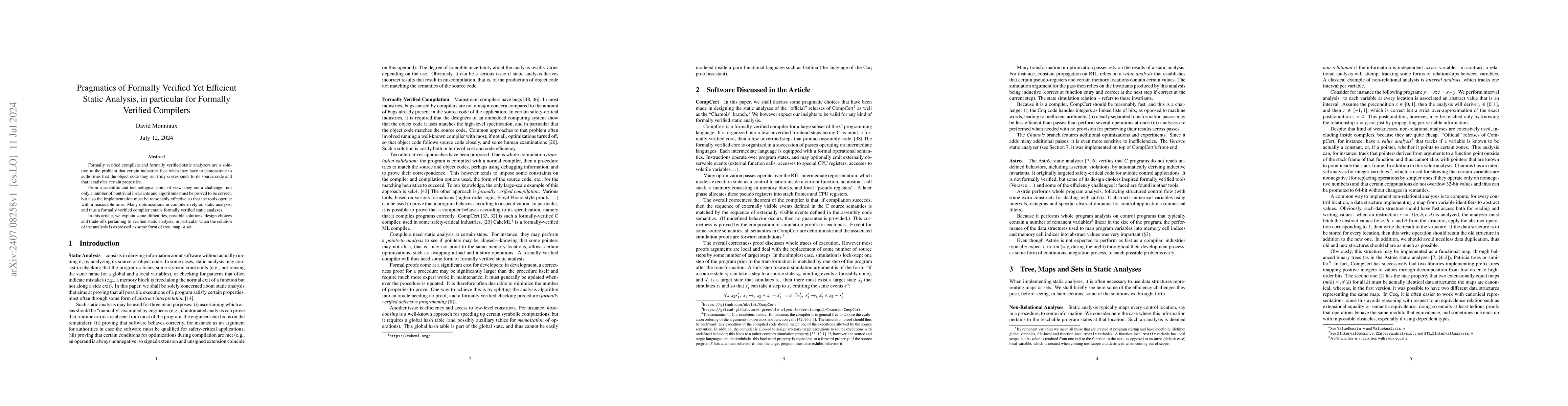 This paper explores the pragmatics of creating efficient, formally verified static analyses for compilers, focusing on challenges and trade-offs. It addresses the need for correctness proofs alongside computational efficiency, highlighting design choices and solutions for analyses that output complex data structures like trees, maps, or sets.