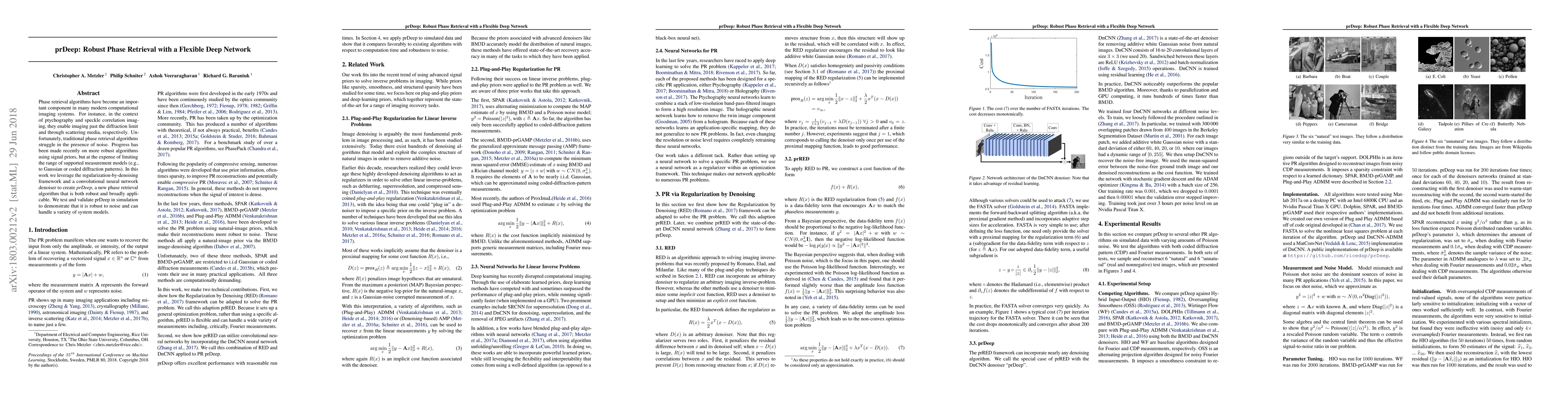 prDeep is a robust phase retrieval algorithm utilizing a convolutional neural network denoiser within the regularization-by-denoising framework, enabling it to handle noise and support diverse measurement models, validated through simulations. The method is broadly applicable in computational imaging systems like ptychography and speckle correlation imaging.