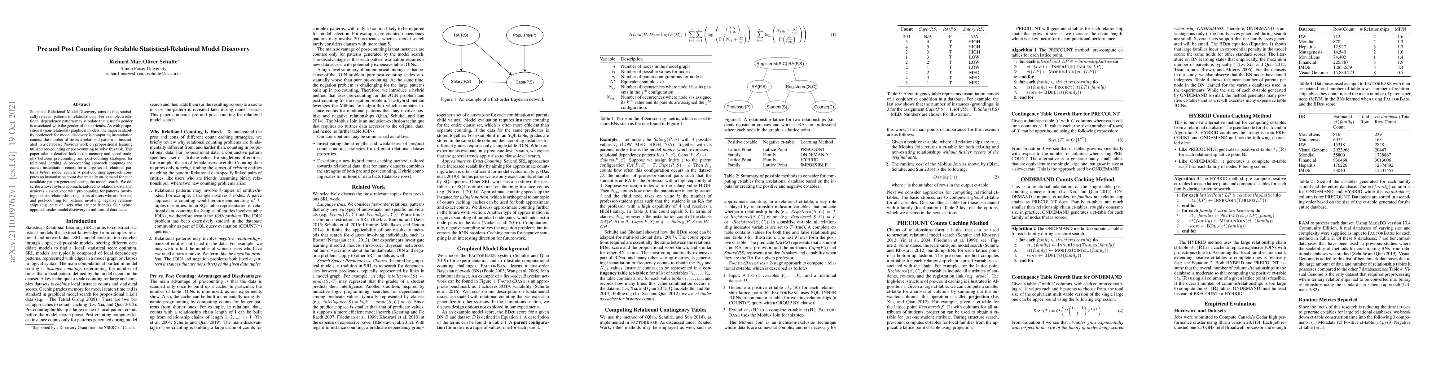 This paper investigates the trade-offs between pre-counting and post-counting strategies for discovering scalable statistical-relational models, proposing a hybrid approach that optimizes memory and speed by pre-counting for positive relationships and post-counting for negative relationships. The hybrid method effectively scales model discovery to large datasets.