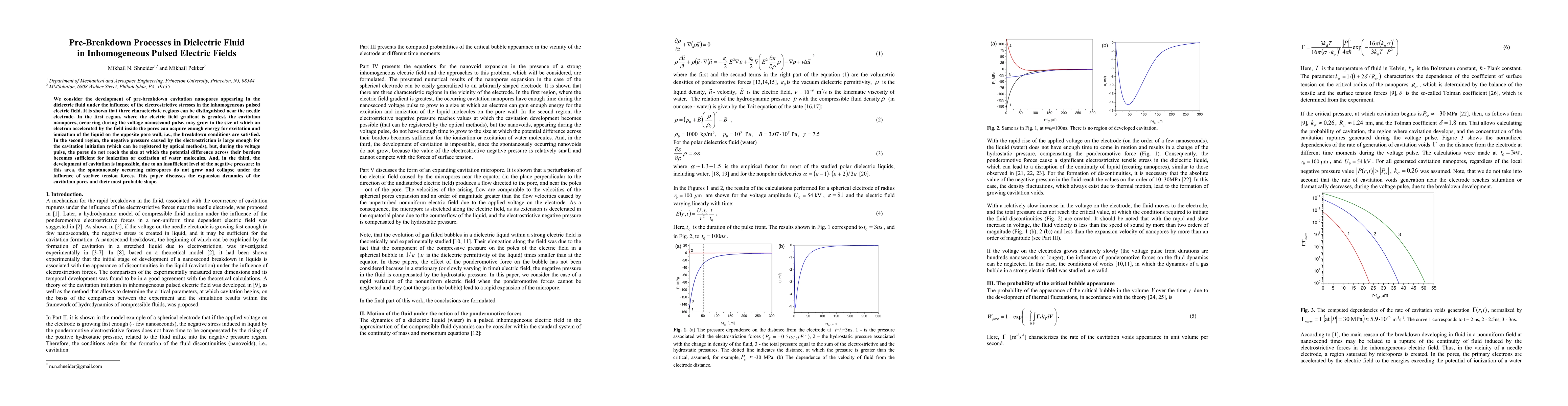 This paper investigates the formation of pre-breakdown cavitation nanopores in dielectric fluid under inhomogeneous pulsed electric fields, identifying three distinct regions near a needle electrode where different cavitation behaviors occur, including potential breakdown conditions and the dynamics of pore growth.