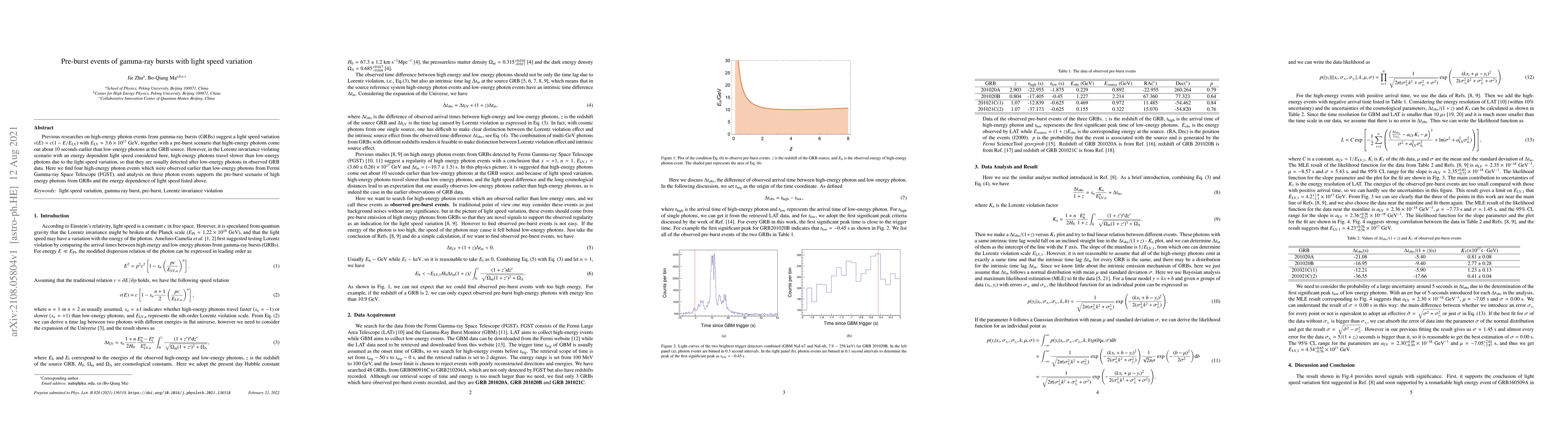 This paper investigates gamma-ray bursts (GRBs) with an energy-dependent light speed model, finding that high-energy photons should typically arrive later than low-energy photons. However, it identifies four exceptions where high-energy photons were detected first, supporting the pre-burst scenario and the proposed light speed variation model.
