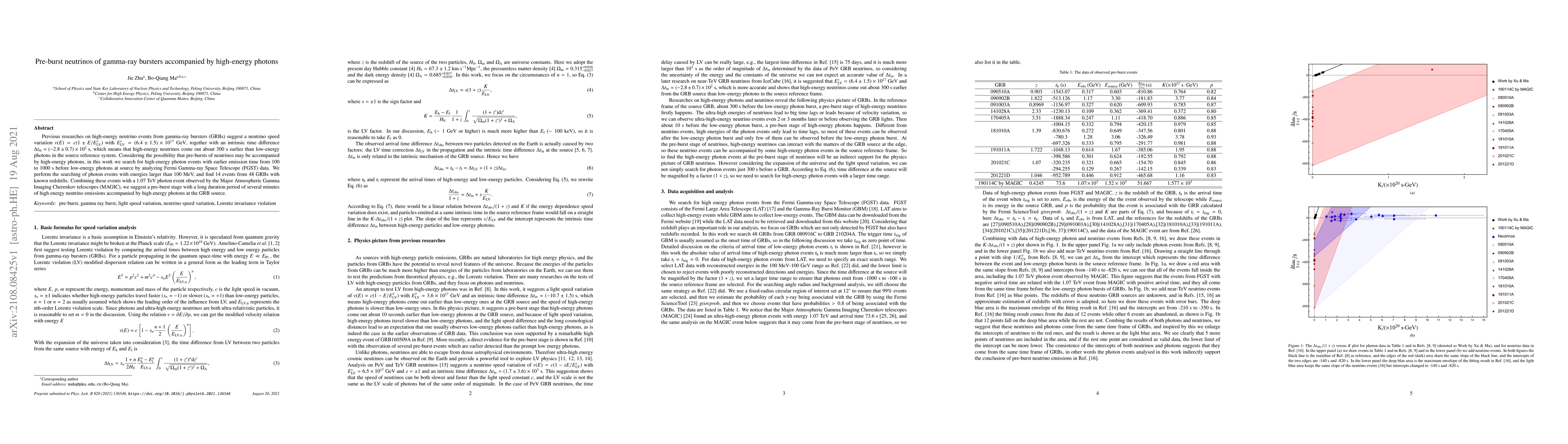This paper investigates the possibility of pre-burst neutrinos accompanied by high-energy photons in gamma-ray bursters (GRBs) using Fermi and MAGIC telescope data. The study finds 14 high-energy photon events preceding low-energy photons by 100-1000 seconds, suggesting a pre-burst stage of several minutes with simultaneous high-energy neutrino and photon emissions.