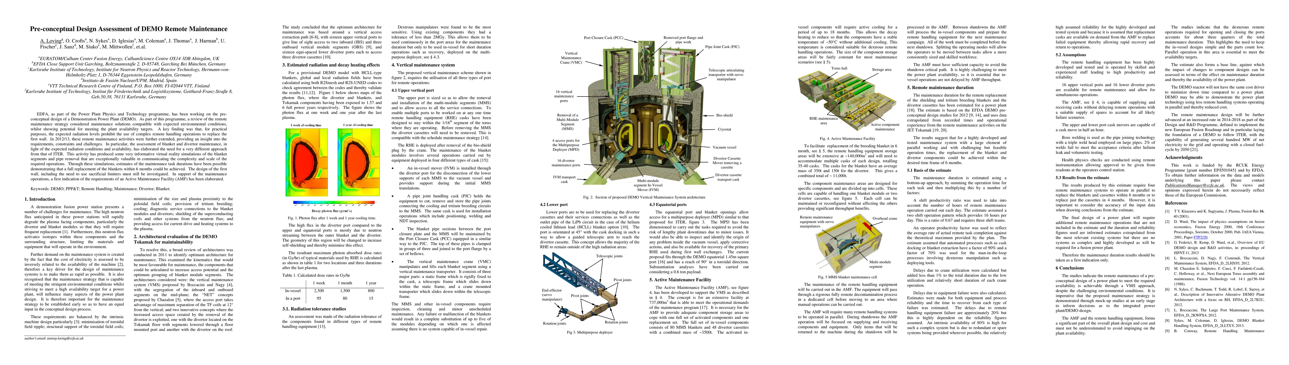 EDFA, as part of the Power Plant Physics and Technology programme, has been working on the pre-conceptual design of a Demonstration Power Plant (DEMO). As part of this programme, a review of the remote maintenance strategy considered maintenance solutions compatible with expected environmental conditions, whilst showing potential for meeting the plant availability targets. A key finding was that, for practical purposes, the expected radiation levels prohibit the use of complex remote handling operations to replace the first wall. In 2012/13, these remote maintenance activities were further extended, providing an insight into the requirements, constraints and challenges. In particular, the assessment of blanket and divertor maintenance, in light of the expected radiation conditions and availability, has elaborated the need for a very different approach from that of ITER. This activity has produced some very informative virtual reality simulations of the blanket segments and pipe removal that are exceptionally valuable in communicating the complexity and scale of the required operations. Through these simulations, estimates of the maintenance task durations have been possible demonstrating that a full replacement of the blankets within 6 months could be achieved. The design of the first wall, including the need to use sacrificial limiters must still be investigated. In support of the maintenance operations, a first indication of the requirements of an Active Maintenance Facility (AMF) has been elaborated.