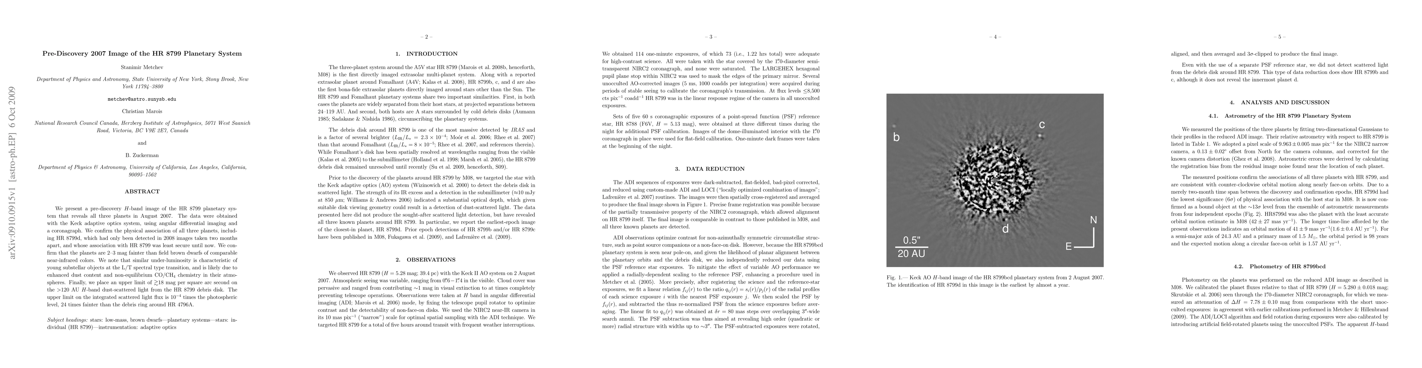 We present a pre-discovery H-band image of the HR 8799 planetary system that reveals all three planets in August 2007. The data were obtained with the Keck adaptive optics system, using angular differential imaging and a coronagraph. We confirm the physical association of all three planets, including HR 8799d, which had only been detected in 2008 images taken two months apart, and whose association with HR 8799 was least secure until now. We confirm that the planets are 2-3 mag fainter than field brown dwarfs of comparable near-infrared colors. We note that similar under-luminosity is characteristic of young substellar objects at the L/T spectral type transition, and is likely due to enhanced dust content and non-equilibrium CO/CH_4 chemistry in their atmospheres. Finally, we place an upper limit of 18 mag per square arc second on the >120 AU H-band dust-scattered light from the HR 8799 debris disk. The upper limit on the integrated scattered light flux is 1e-4 times the photospheric level, 24 times fainter than the debris ring around HR 4796A.