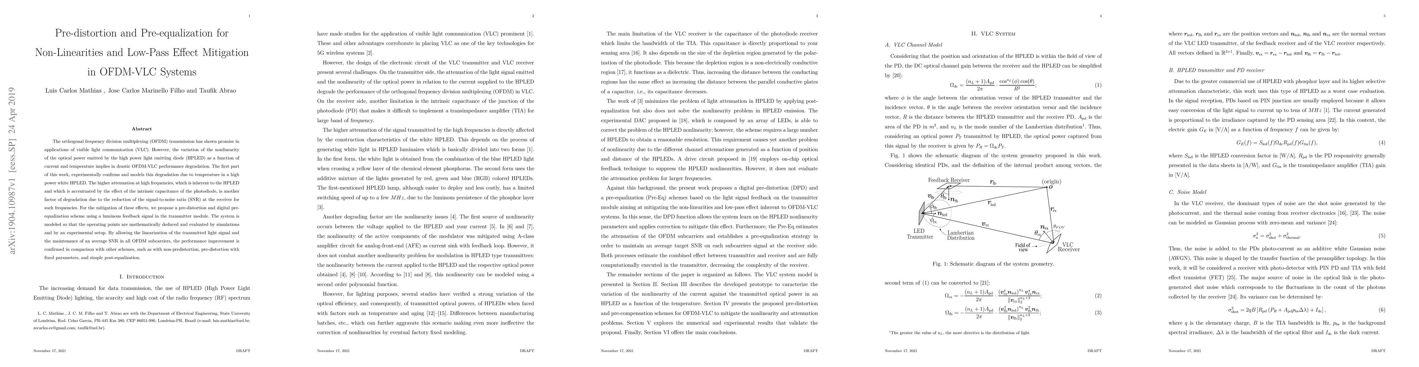 The orthogonal frequency division multiplexing (OFDM) transmission has shown promise in applications of visible light communication (VLC). However, the variation of the nonlinearity of the optical power emitted by the high power light emitting diode (HPLED) as a function of current and temperature implies in drastic OFDM-VLC performance degradation. The first part of this work, experimentally confirms and models this degradation due to temperature in a high power white HPLED. The higher attenuation at high frequencies, which is inherent to the HPLED and which is accentuated by the effect of the intrinsic capacitance of the photodiode, is another factor of degradation due to the reduction of the signal-to-noise ratio (SNR) at the receiver for such frequencies. For the mitigation of these effects, we propose a pre-distortion and digital pre-equalization scheme using a luminous feedback signal in the transmitter module. The system is modeled so that the operating points are mathematically deduced and evaluated by simulations and by an experimental setup. By allowing the linearization of the transmitted light signal and the maintenance of an average SNR in all OFDM subcarriers, the performance improvement is confirmed in comparison with other schemes, such as with non-predistortion, pre-distortion with fixed parameters, and simple post-equalization.