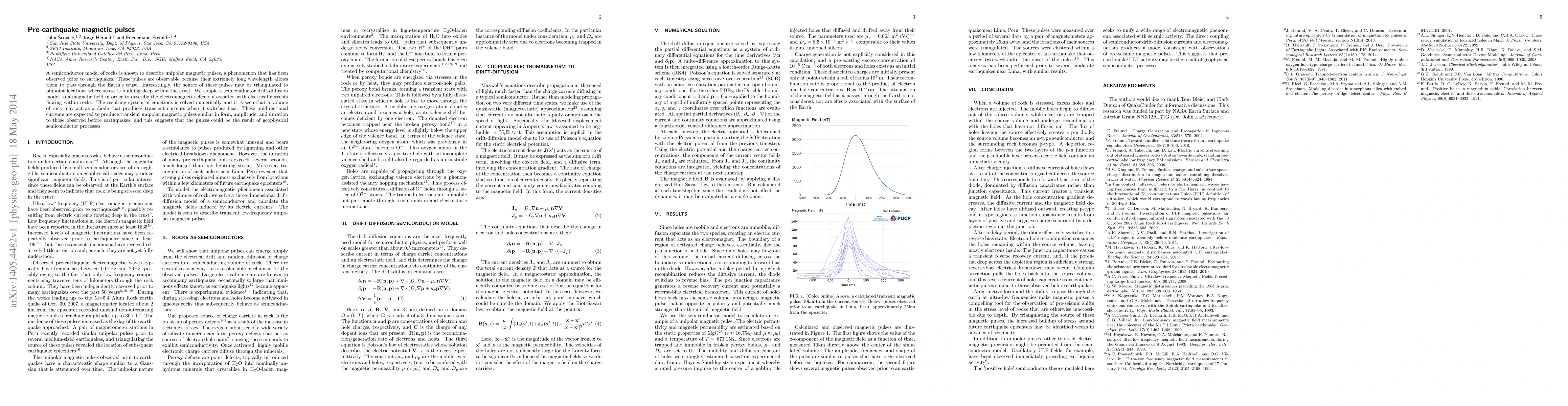 A semiconductor model of rocks is shown to describe unipolar magnetic pulses, a phenomenon that has been observed prior to earthquakes. These pulses are observable because their extremely long wavelength allows them to pass through the Earth's crust. Interestingly, the source of these pulses may be triangulated to pinpoint locations where stress is building deep within the crust. We couple a semiconductor drift-diffusion model to a magnetic field in order to describe the electromagnetic effects associated with electrical currents flowing within rocks. The resulting system of equations is solved numerically and it is seen that a volume of rock may act as a diode that produces transient currents when it switches bias. These unidirectional currents are expected to produce transient unipolar magnetic pulses similar in form, amplitude, and duration to those observed before earthquakes, and this suggests that the pulses could be the result of geophysical semiconductor processes.