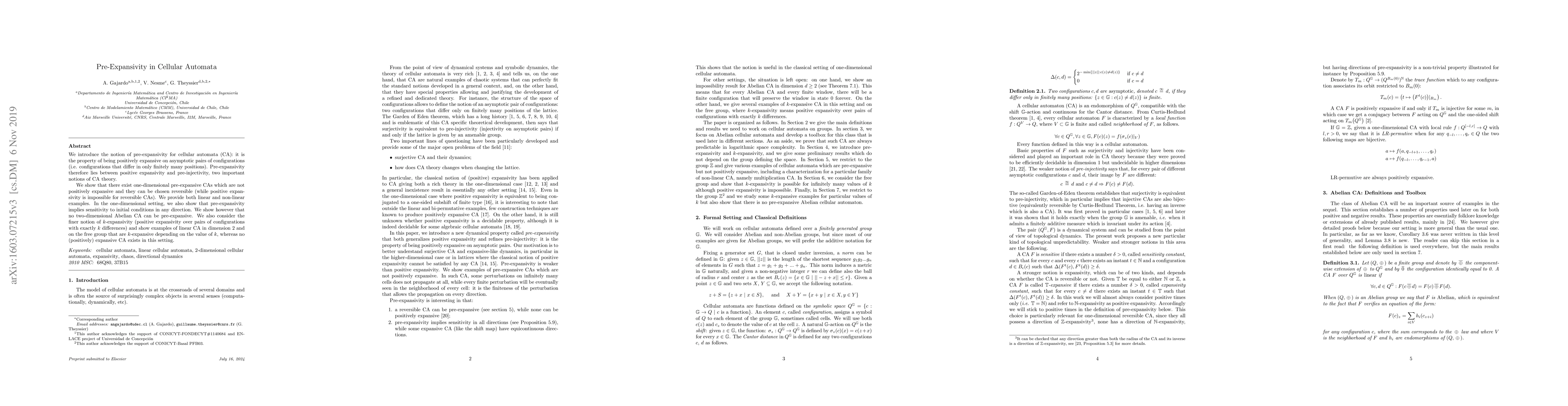 This work contributes to the theory of cellular automata by introducing a new property, pre-expansivity, which helps in understanding the behavior of CAs in terms of information propagation and sensitivity to initial conditions.