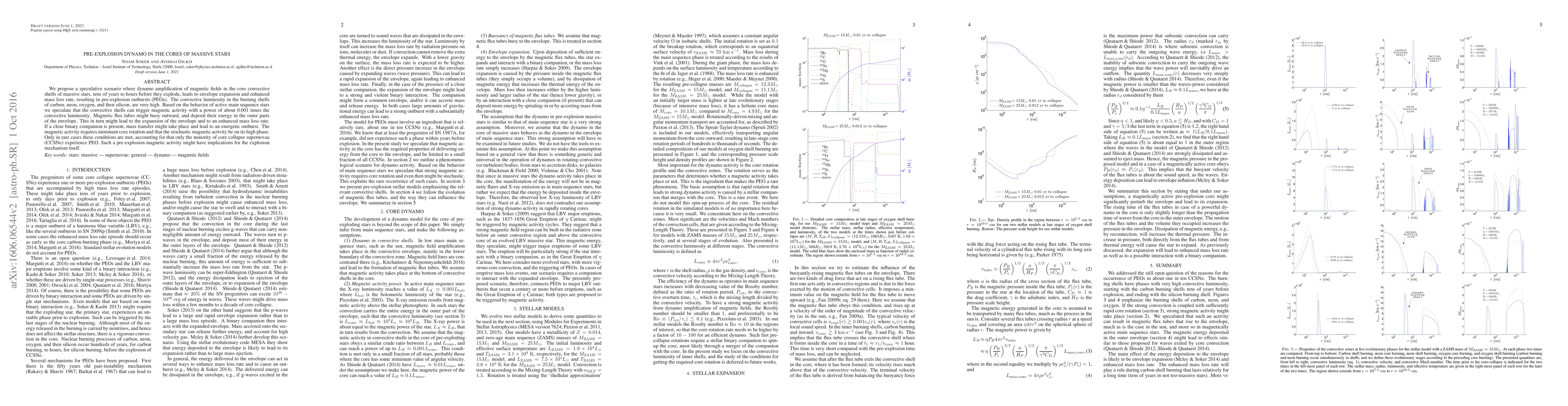 We propose a speculative scenario where dynamo amplification of magnetic fields in the core convective shells of massive stars, tens of years to hours before they explode, leads to envelope expansion and enhanced mass loss rate, resulting in pre-explosion outbursts (PEOs). The convective luminosity in the burning shells of carbon, neon, oxygen, and then silicon, are very high. Based on the behavior of active main sequence stars we speculate that the convective shells can trigger magnetic activity with a power of about 0.001 times the convective luminosity. Magnetic flux tubes might buoy outward, and deposit their energy in the outer parts of the envelope. This in turn might lead to the expansion of the envelope and to an enhanced mass loss rate. If a close binary companion is present, mass transfer might take place and lead to an energetic outburst. The magnetic activity requires minimum core rotation and that the stochastic magnetic activity be on its high phase. Only in rare cases these conditions are met, accounting for that only the minority of core collapse supernovae (CCSNe) experience PEO. Such a pre-explosion magnetic activity might have implications for the explosion mechanism itself.