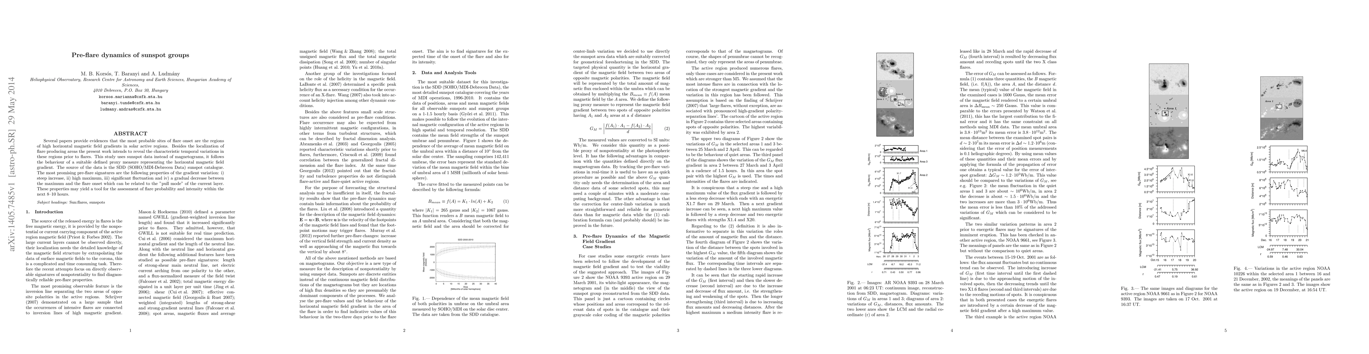 Several papers provide evidences that the most probable sites of flare onset are the regions of high horizontal magnetic field gradients in solar active regions. Besides the localization of flare producing areas the present work intends to reveal the characteristic temporal variations in these regions prior to flares. This study uses sunspot data instead of magnetograms, it follows the behaviour of a suitable defined proxy measure representing the horizontal magnetic field gradient. The source of the data is the SDD (SOHO/MDI-Debrecen Data) sunspot catalogue. The most promising pre-flare signatures are the following properties of the gradient variation: i) steep increase, ii) high maximum, iii) significant fluctuation and iv) a gradual decrease between the maximum and the flare onset which can be related to the "pull mode" of the current layer. These properties may yield a tool for the assessment of flare probability and intensity within the next 8-10 hours.