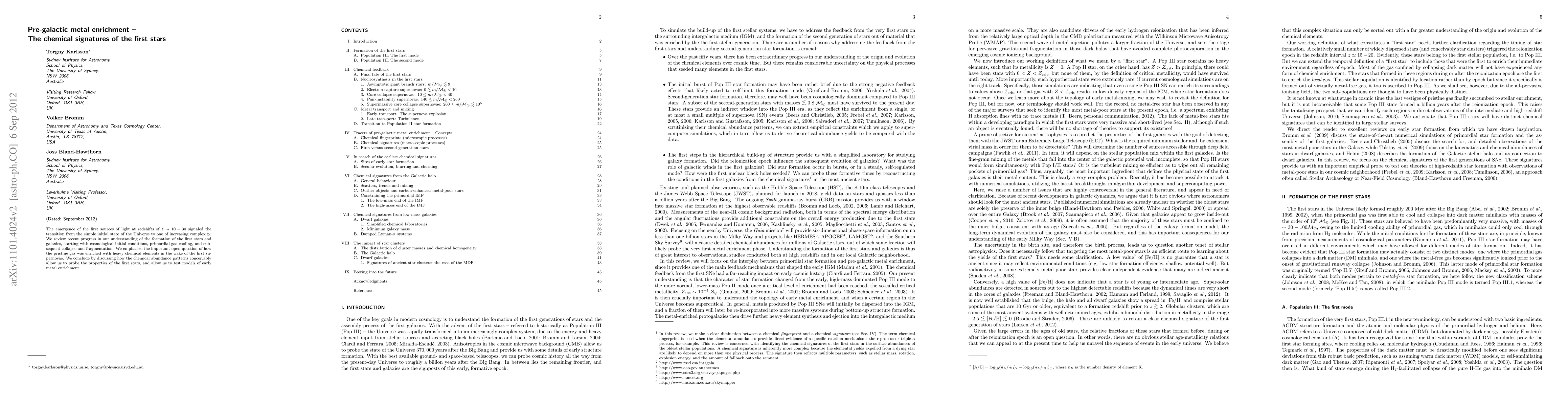 The emergence of the first sources of light at redshifts of z ~ 10-30 signaled the transition from the simple initial state of the Universe to one of increasing complexity. We review recent progress in our understanding of the formation of the first stars and galaxies, starting with cosmological initial conditions, primordial gas cooling, and subsequent collapse and fragmentation. We emphasize the important open question of how the pristine gas was enriched with heavy chemical elements in the wake of the first supernovae. We conclude by discussing how the chemical abundance patterns conceivably allow us to probe the properties of the first stars and subsequent stellar generations, and allow us to test models of early metal enrichment.
