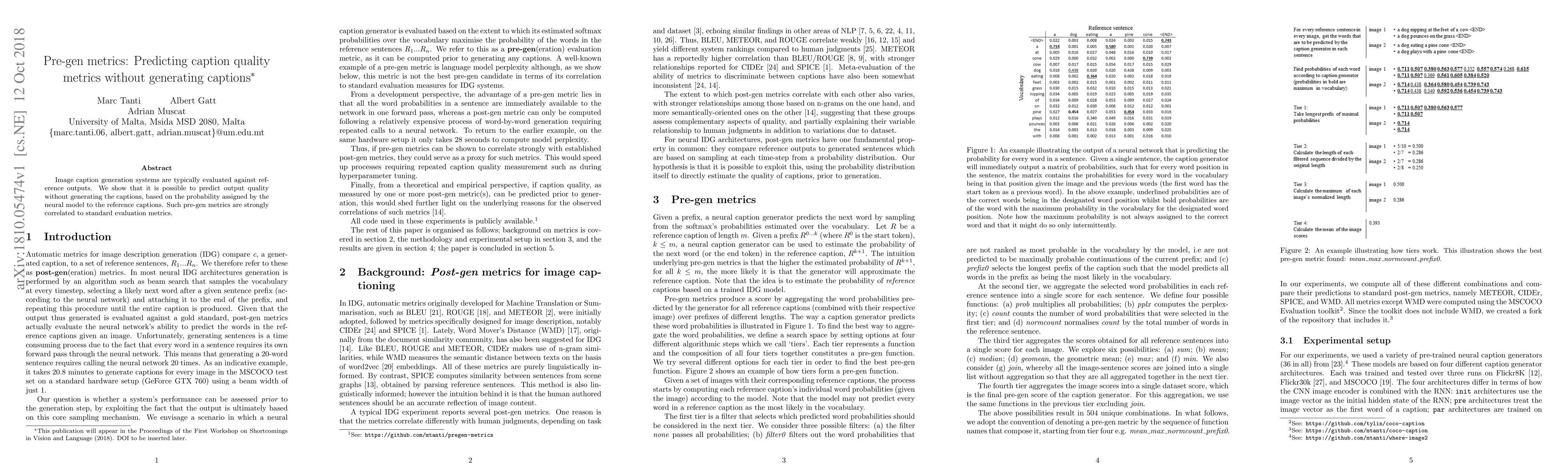 Image caption generation systems are typically evaluated against reference outputs. We show that it is possible to predict output quality without generating the captions, based on the probability assigned by the neural model to the reference captions. Such pre-gen metrics are strongly correlated to standard evaluation metrics.