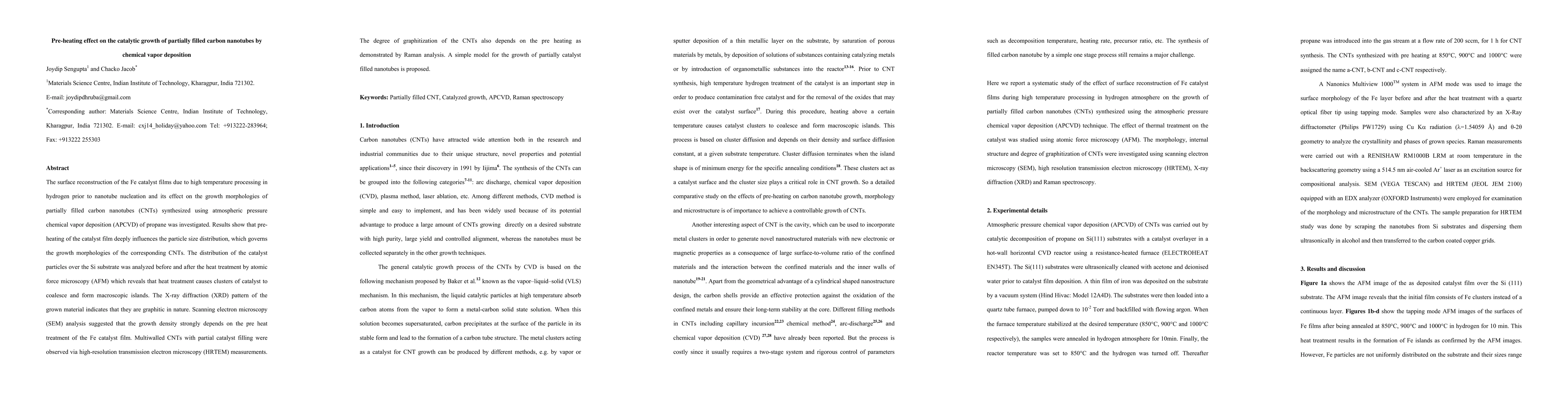 This study investigates how pre-heating Fe catalyst films in hydrogen affects the growth of partially filled carbon nanotubes via atmospheric pressure chemical vapor deposition. Pre-heating causes catalyst particle coalescence and influences the growth density and morphologies of the resulting CNTs, with varying degrees of graphitization observed depending on the heat treatment.