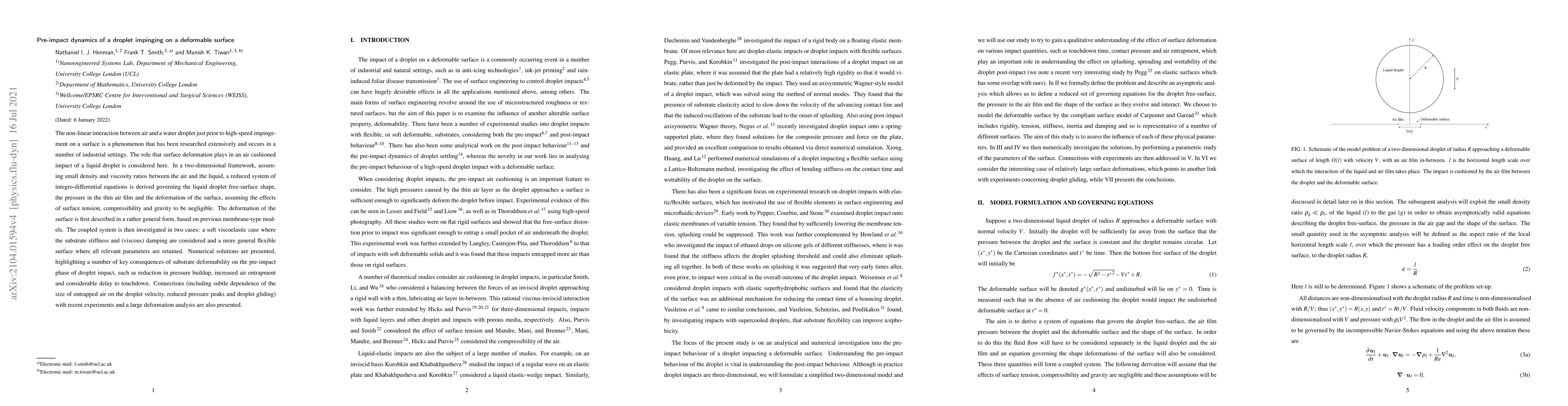 The non-linear interaction between air and a water droplet just prior to high-speed impingement on a surface is a phenomenon that has been researched extensively and occurs in a number of industrial settings. The role that surface deformation plays in an air cushioned impact of a liquid droplet is considered here. In a two-dimensional framework, assuming small density and viscosity ratios between the air and the liquid, a reduced system of integro-differential equations is derived governing the liquid droplet free-surface shape, the pressure in the thin air film and the deformation of the surface, assuming the effects of surface tension, compressibility and gravity to be negligible. The deformation of the surface is first described in a rather general form, based on previous membrane-type models. The coupled system is then investigated in two cases: a soft viscoelastic case where the substrate stiffness and (viscous) damping are considered and a more general flexible surface where all relevant parameters are retained. Numerical solutions are presented, highlighting a number of key consequences of substrate deformability on the pre-impact phase of droplet impact, such as reduction in pressure buildup, increased air entrapment and considerable delay to touchdown. Connections (including subtle dependence of the size of entrapped air on the droplet velocity, reduced pressure peaks and droplet gliding) with recent experiments and a large deformation analysis are also presented.