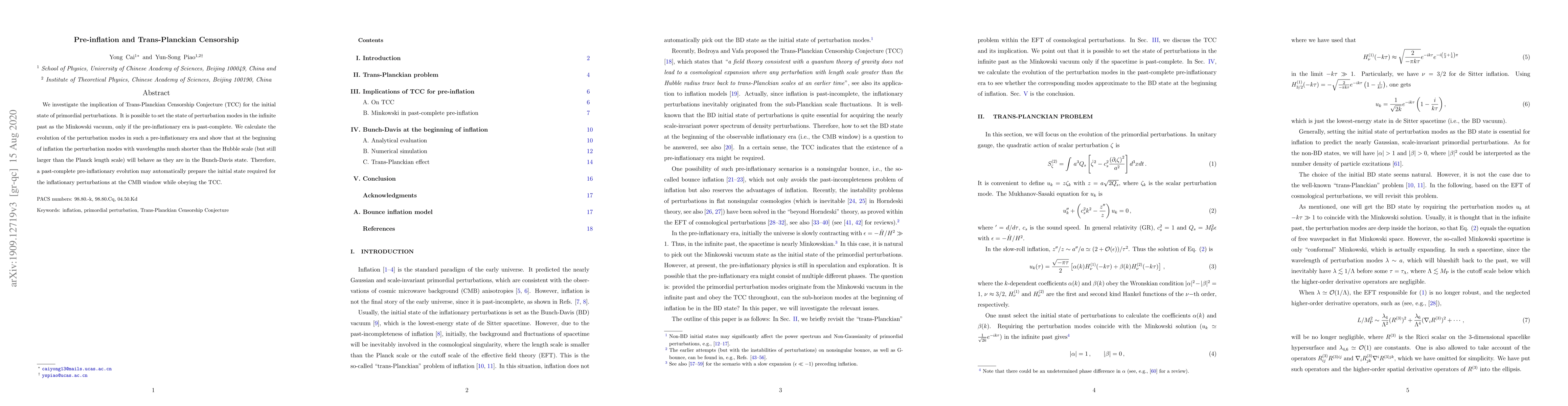 This paper explores the implications of the Trans-Planckian Censorship Conjecture (TCC) on primordial perturbations, demonstrating that a past-complete pre-inflationary era can set the initial state of perturbation modes as the Minkowski vacuum. It shows that perturbation modes with wavelengths shorter than the Hubble scale but larger than the Planck length behave similarly to the Bunch-Davis state at the start of inflation, thus potentially satisfying TCC while preparing the required initial state for inflationary perturbations.