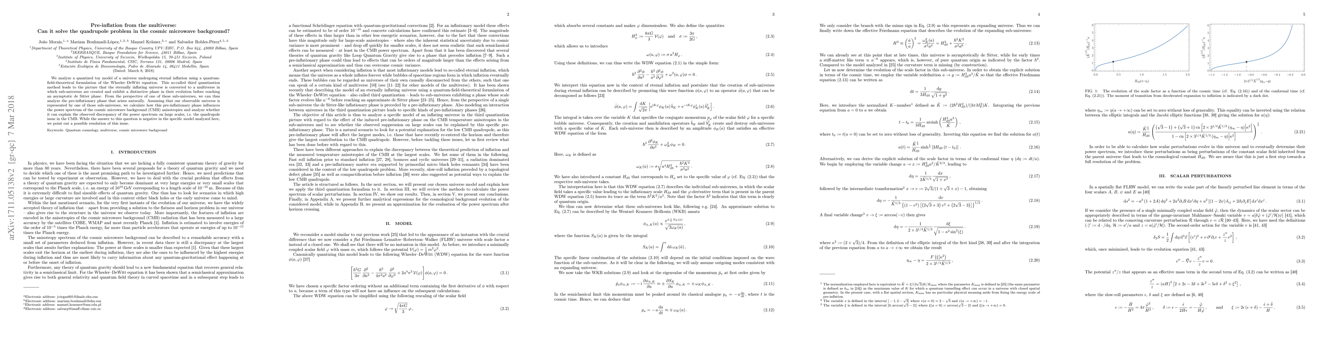 We analyze a quantized toy model of a universe undergoing eternal inflation using a quantum-field-theoretical formulation of the Wheeler-DeWitt equation. This so-called third quantization method leads to the picture that the eternally inflating universe is converted to a multiverse in which sub-universes are created and exhibit a distinctive phase in their evolution before reaching an asymptotic de Sitter phase. From the perspective of one of these sub-universes, we can thus analyze the pre-inflationary phase that arises naturally. Assuming that our observable universe is represented by one of those sub-universes, we calculate how this pre-inflationary phase influences the power spectrum of the cosmic microwave background (CMB) anisotropies and analyze whether it can explain the observed discrepancy of the power spectrum on large scales, i.e. the quadrupole issue in the CMB. While the answer to this question is negative in the specific model analyzed here, we point out a possible resolution of this issue.