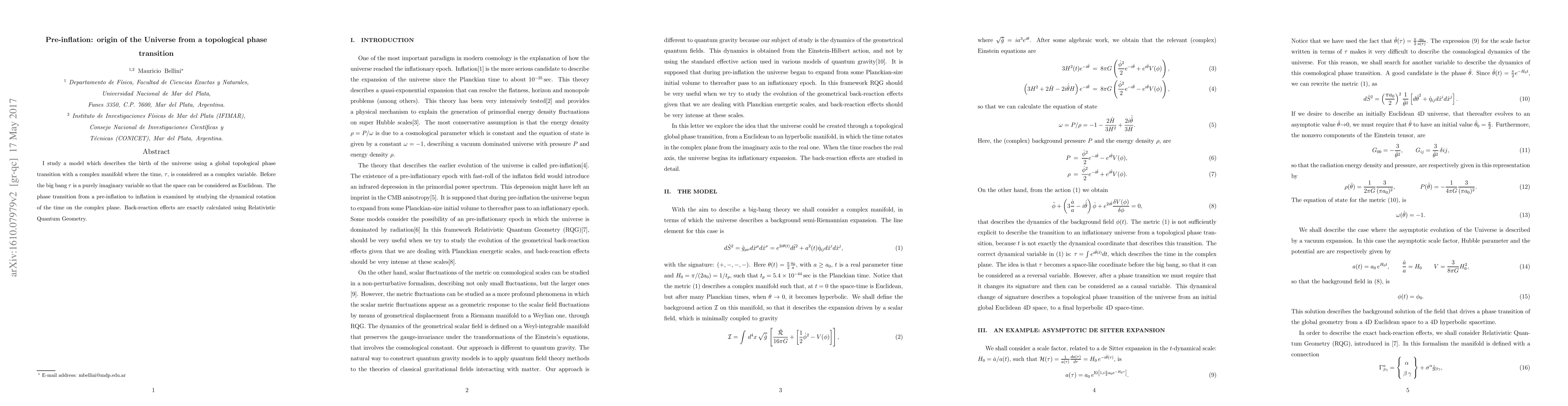 I study a model which describes the birth of the universe using a global topological phase transition with a complex manifold where the time, $\tau$, is considered as a complex variable. Before the big bang $\tau$ is a purely imaginary variable so that the space can be considered as Euclidean. The phase transition from a pre-inflation to inflation is examined by studying the dynamical rotation of the time on the complex plane. Back-reaction effects are exactly calculated using Relativistic Quantum Geometry.