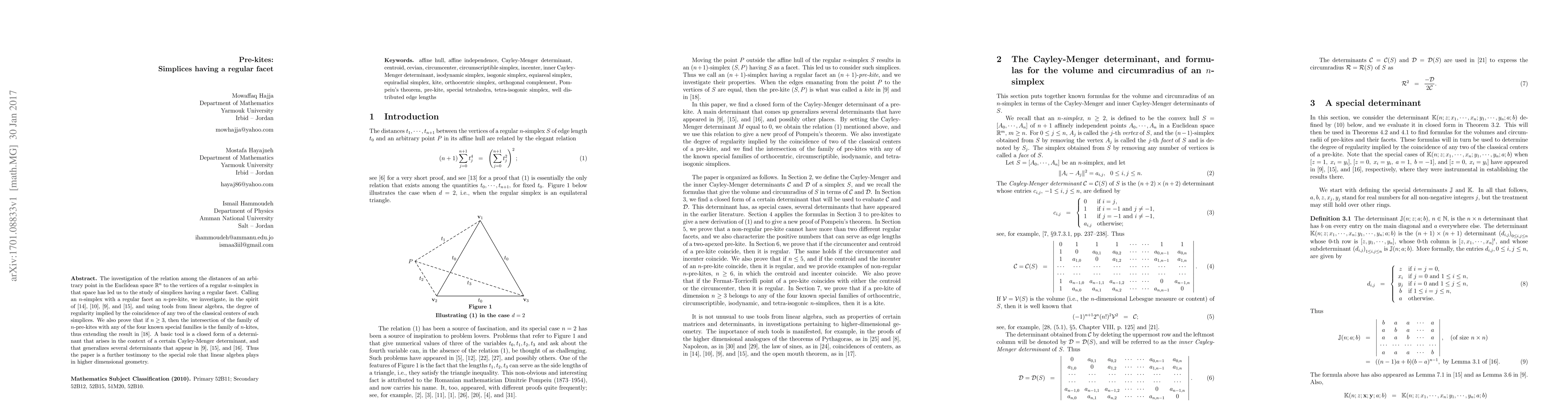 The investigation of the relation among the distances of an arbitrary point in the Euclidean space $\mathbb{R}^n$ to the vertices of a regular $n$-simplex in that space has led us to the study of simplices having a regular facet. Calling an $n$-simplex with a regular facet an $n$-pre-kite, we investigate, in the spirit of [4], [10], [9], and [15], and using tools from linear algebra, the degree of regularity implied by the coincidence of any two of the classical centers of such simplices. We also prove that if $n \ge 3$, then the intersection of the family of $n$-pre-kites with any of the four known special families is the family of $n$-kites, thus extending the result in [18]. A basic tool is a closed form of a determinant that arises in the context of a certain Cayley-Menger determinant, and that generalizes several determinants that appear in [9], [15], and [16]. Thus the paper is a further testimony to the special role that linear algebra plays in higher dimensional geometry.