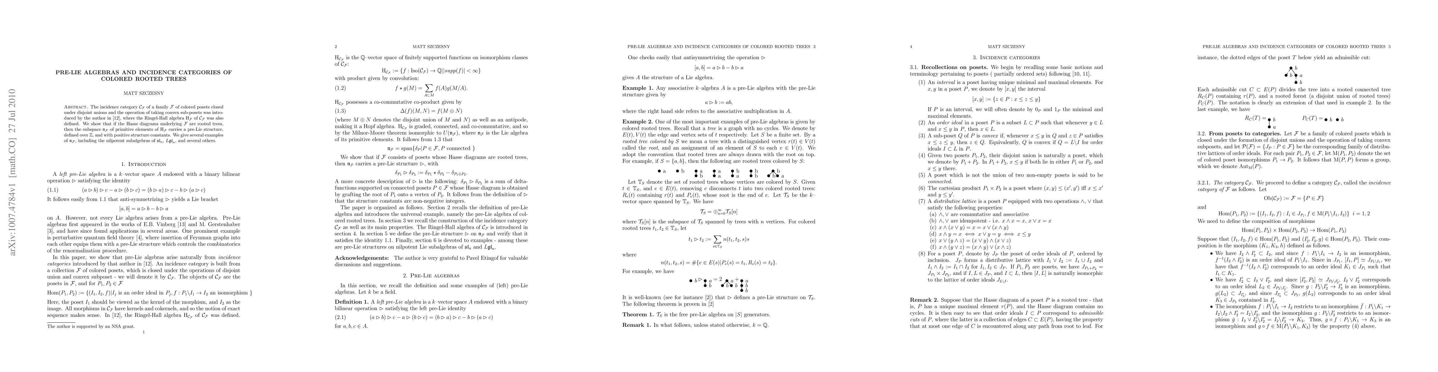 The incidence category $\C_{\F}$ of a family $\F$ of colored posets closed under disjoint unions and the operation of taking convex sub-posets was introduced by the author in \cite{Sz}, where the Ringel-Hall algebra $\H_{\F}$ of $\C_{\F}$ was also defined. We show that if the Hasse diagrams underlying $\F$ are rooted trees, then the subspace $\n_{\F}$ of primitive elements of $\H_{\F}$ carries a pre-Lie structure, defined over $\mathbb{Z}$, and with positive structure constants. We give several examples of $\n_{\F}$, including the nilpotent subalgebras of $\mathfrak{sl}_n$, $L \mathfrak{gl}_n$, and several others.