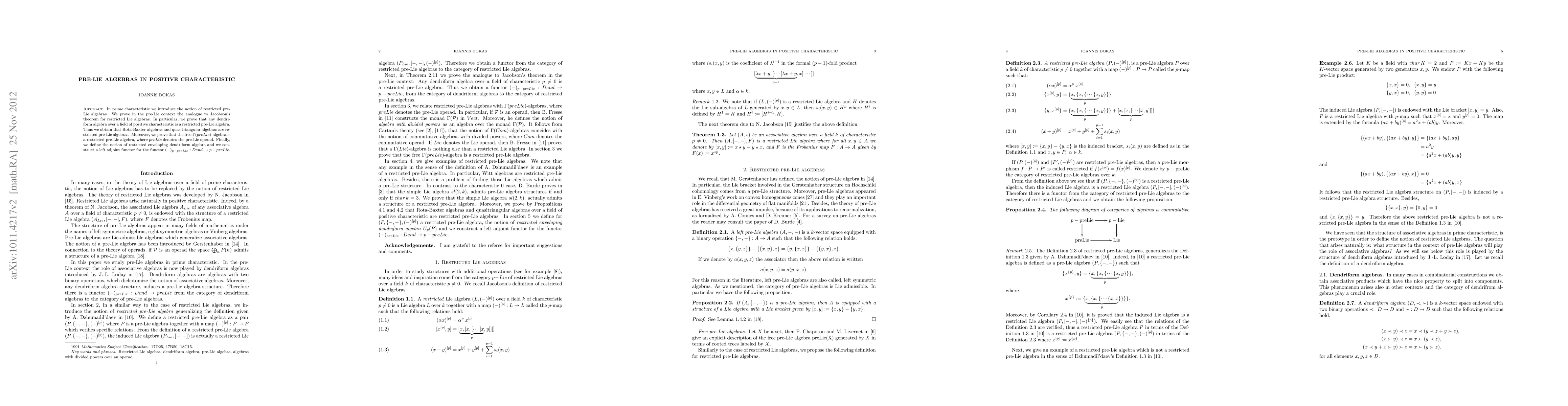 In prime characteristic we introduce the notion of restricted pre-Lie algebras. We prove in the pre-Lie context the analogue to Jacobson's theorem for restricted Lie algebras. In particular, we prove that any dendriform algebra over a field of positive characteristic is a restricted pre-Lie algebra. Thus we obtain that Rota-Baxter algebras and quasitriangular algebras are restricted pre-Lie algebras. Moreover, we prove that the free $\Gamma(\calligra{preLie})$-algebra is a restricted pre-Lie algebra, where $\calligra{preLie}$ denotes the pre-Lie operad. Finally, we define the notion of restricted enveloping dendriform algebra and we construct a left adjoint functor for the functor $(-)_{p-preLie}: Dend \rightarrow p-preLie$.