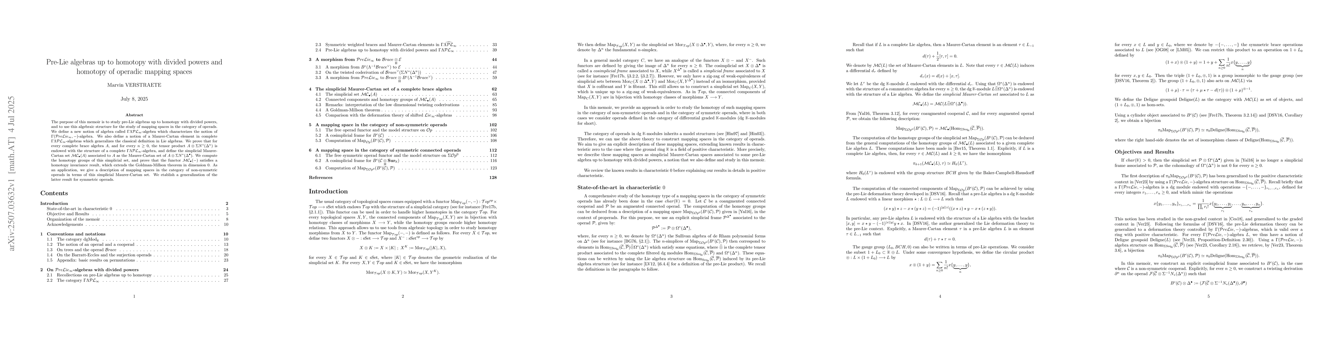 The purpose of this memoir is to study pre-Lie algebras up to homotopy with divided powers, and to use this algebraic structure for the study of mapping spaces in the category of operads. We define a new notion of algebra called $\Gamma\Lambda\mathcal{PL}_\infty$-algebra which characterizes the notion of $\Gamma(\mathcal{P}re\mathcal{L}ie_\infty,-)$-algebra. We also define a notion of a Maurer-Cartan element in complete $\Gamma\Lambda\mathcal{PL}_\infty$-algebras which generalizes the classical definition in Lie algebras. We prove that for every complete brace algebra $A$, and for every $n\geq 0$, the tensor product $A\otimes\Sigma N^*(\Delta^n)$ is endowed with the structure of a complete $\Gamma\Lambda\mathcal{PL}_\infty$-algebra, and define the simplicial Maurer-Cartan set $\mathcal{MC}_\bullet(A)$ associated to $A$ as the Maurer-Cartan set of $ A\otimes\Sigma N^*(\Delta^\bullet)$. We compute the homotopy groups of this simplicial set, and prove that the functor $\mathcal{MC}_\bullet(-)$ satisfies a homotopy invariance result, which extends the Goldman-Millson theorem in dimension $0$. As an application, we give a description of mapping spaces in the category of non-symmetric operads in terms of this simplicial Maurer-Cartan set. We etablish a generalization of the latter result for symmetric operads.