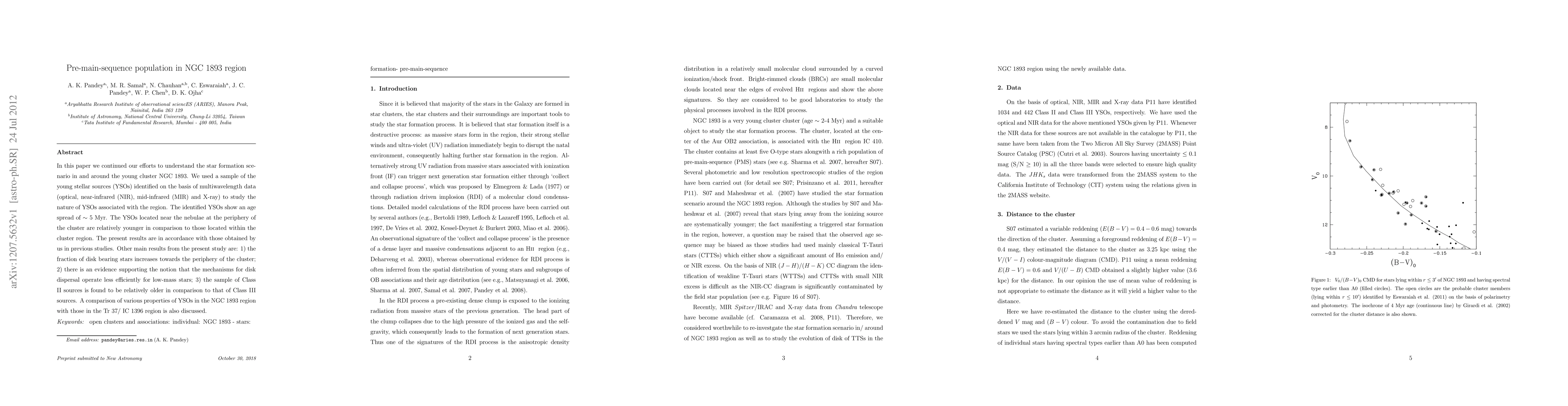 This paper investigates the star formation scenario in NGC 1893, revealing a 5 Myr age spread among young stellar objects (YSOs) with younger YSOs near the nebulae. Key findings include an increase in disk-bearing stars towards the periphery, less efficient disk dispersal mechanisms for low-mass stars, and older Class II sources compared to Class III.