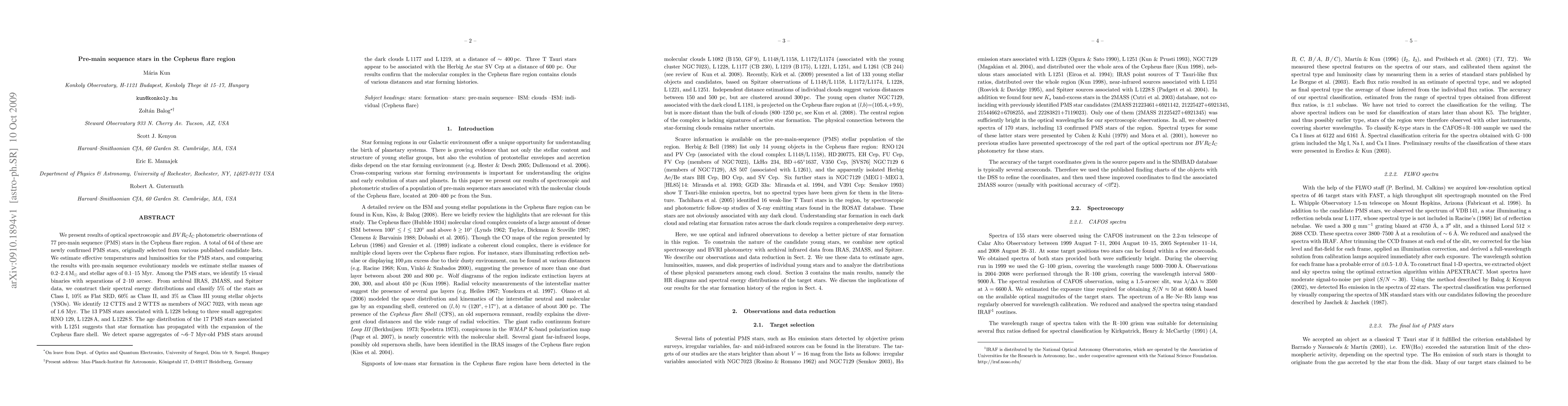 This study analyzes 77 pre-main sequence stars in the Cepheus flare region using optical spectroscopy and photometry, confirming 64 new PMS stars and estimating their masses and ages. The research identifies star formation patterns and various young stellar object classes, revealing diverse star-forming histories across the region.