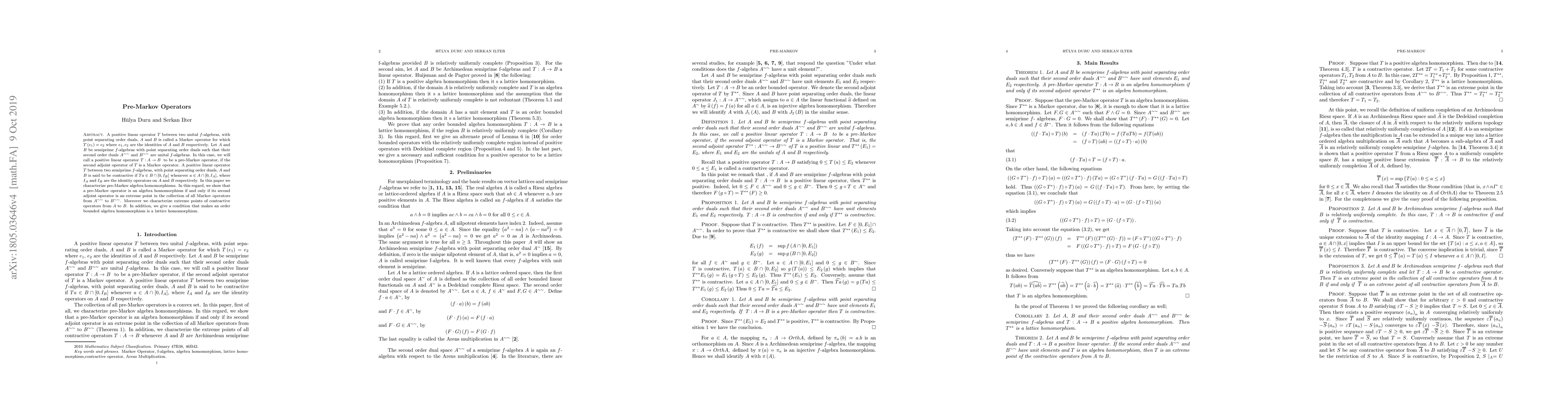 A positive linear operator $T$ between two unital $f$-algebras, with point separating order duals, $A$ and $B$ is called a Markov operator for which $% T\left( e_{1}\right) =e_{2}$ where $e_{1},e_{2}$ are the identities of $A$ and $B$ respectively. Let $A$ and $B$ be semiprime $f$-algebras with point separating order duals such that their second order duals $A^{\sim \sim }$ and $B^{\sim \sim }$ are unital $f$-algebras. In this case, we will call a positive linear operator $T:A\rightarrow B$ \ to be a Pre-Markov operator, if the second adjoint operator of $T$ is a Markov operator. A positive linear operator $T$ between two semiprime $f$-algebras, with point separating order duals, $A$ and $B$ is said to be contractive if $Ta\in B\cap \left[ 0,I_{B}\right] $ whenever $a\in A\cap \left[ 0,I_{A}\right] $, where $I_{A}$ and $I_{B}$ are the identity operators on $A$ and $B$ respectively. In this paper we characterize pre-Markov algebra homomorphisms. In this regard, we show that a pre-Markov operator is an algebra homomorphism if and only if its second adjoint operator is an extreme point in the collection of all Markov operators from $A^{\sim \sim }$ to $B^{\sim \sim }$. Moreover we characterize extreme points of contractive mappings from $A$ to $B$. In addition, we give a condition that makes an order bounded algebra homomorphism is a lattice homomorphism.