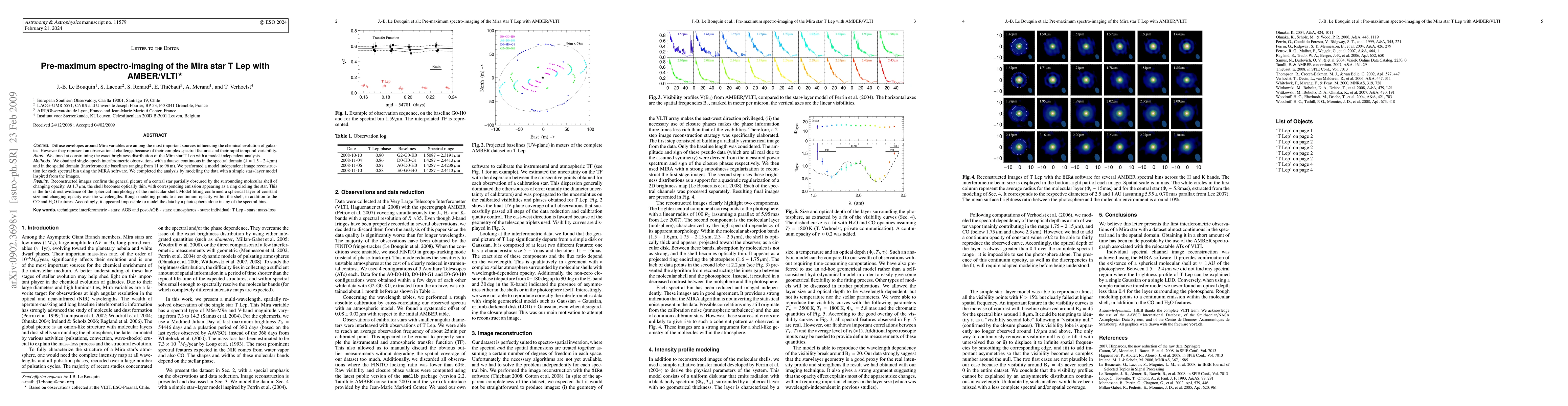 The research uses AMBER/VLTI to analyze T Lep, a Mira star, obtaining single-epoch interferometric observations across a spectral range of 1.5-2.4 microns and baselines from 11 to 96 meters. The study reveals the brightness distribution of T Lep without relying on models, confirming a central star obscured by a molecular shell of varying opacity. At 1.7 microns, the shell turns optically thin, forming a ring around the star - the first evidence of the shell's spherical morphology. Model fitting supports a constant-size, changing-opacity spherical layer, including a continuum opacity within the shell, besides CO and H2O features. The analysis concludes that a photosphere alone cannot model the data in any spectral bin.