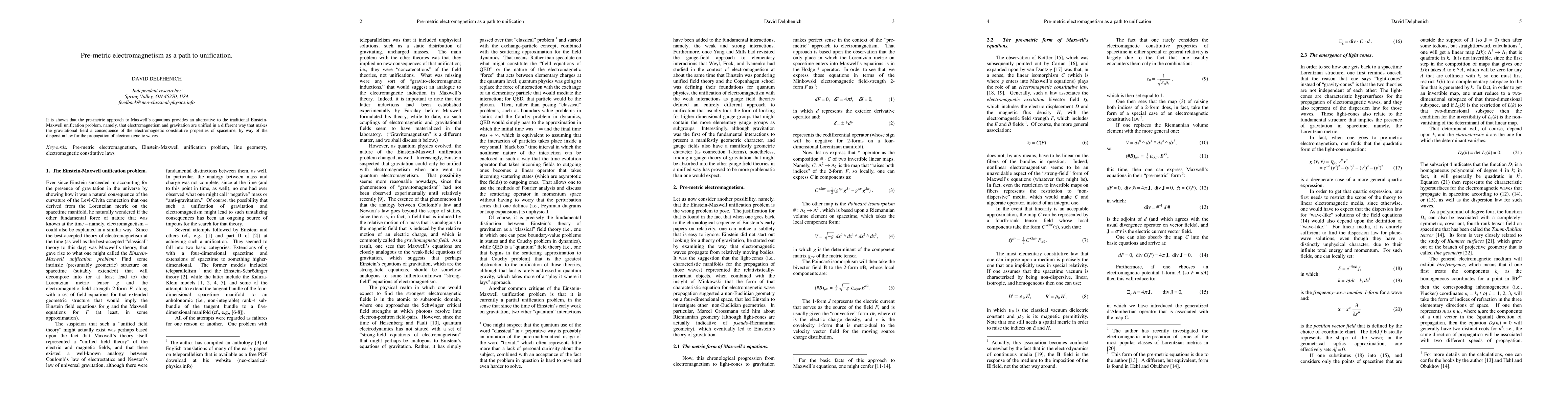 It is shown that the pre-metric approach to Maxwell's equations provides an alternative to the traditional Einstein-Maxwell unification program, namely, that electromagnetism and gravitation are unified in a different way that makes the gravitational field a consequence of the electromagnetic constitute properties of spacetime, by way of the dispersion law for the propagation of electromagnetic waves.