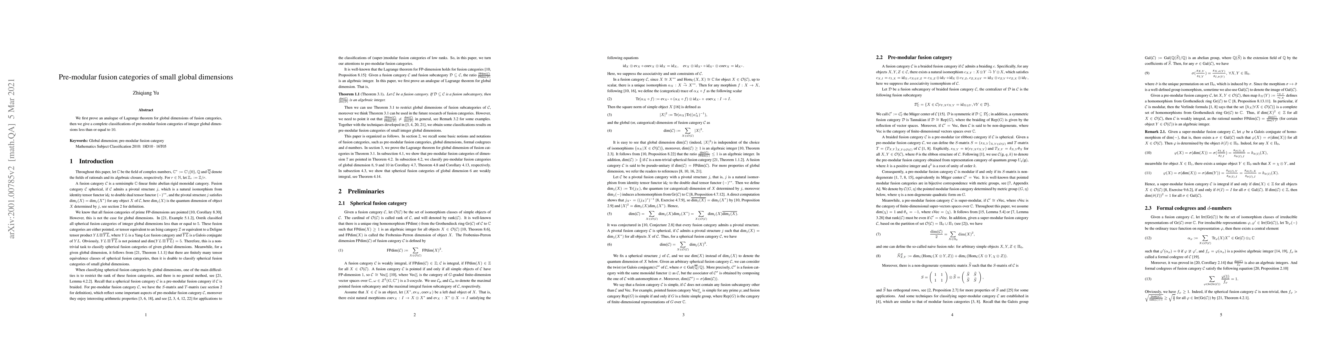 This paper proves an analogue of Lagrange's theorem for the global dimensions of fusion categories and provides a complete classification of pre-modular fusion categories with integer global dimensions ≤ 10.