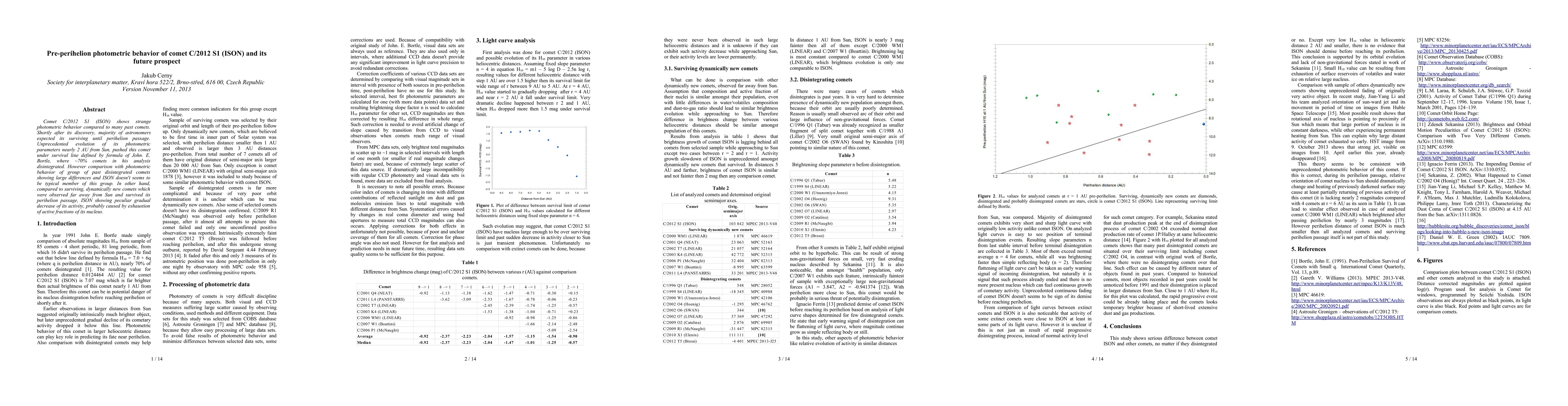 Summary: Comet C/2012 S1 (ISON) exhibited unusual photometric behavior, with its activity decreasing gradually despite being expected to survive perihelion. Unlike typical disintegrated comets, ISON's decline suggests exhaustion of active nuclei rather than disintegration, indicating a unique evolutionary path.