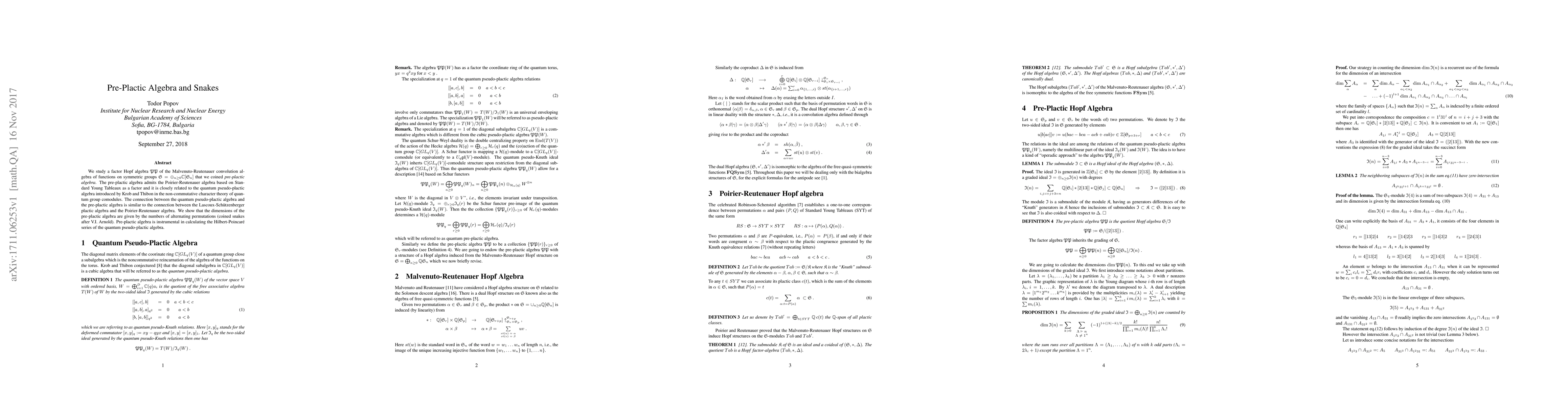 We study a factor Hopf algebra $\mathfrak{PP}$ of the Malvenuto-Reutenauer convolution algebra of functions on symmetric groups ${\mathfrak{S}}=\oplus_{n\geq 0} \mathbb C[{\mathfrak{S}}_n] $ that we coined pre-plactic algebra. The pre-plactic algebra admits the Poirier-Reutenauer algebra based on Standard Young Tableaux as a factor and it is closely related to the quantum pseudo-plactic algebra introduced by Krob and Thibon in the non-commutative character theory of quantum group comodules. The connection between the quantum pseudo-plactic algebra and the pre-plactic algebra is similar to the connection between the Lascoux-Sch\"utzenberger plactic algebra and the Poirier-Reutenauer algebra. We show that the dimensions of the pre-plactic algebra are given by the numbers of alternating permutations (coined snakes after V.I. Arnold). Pre-plactic algebra is instrumental in calculating the Hilbert-Poincar\'e series of the quantum pseudo-plactic algebra.
