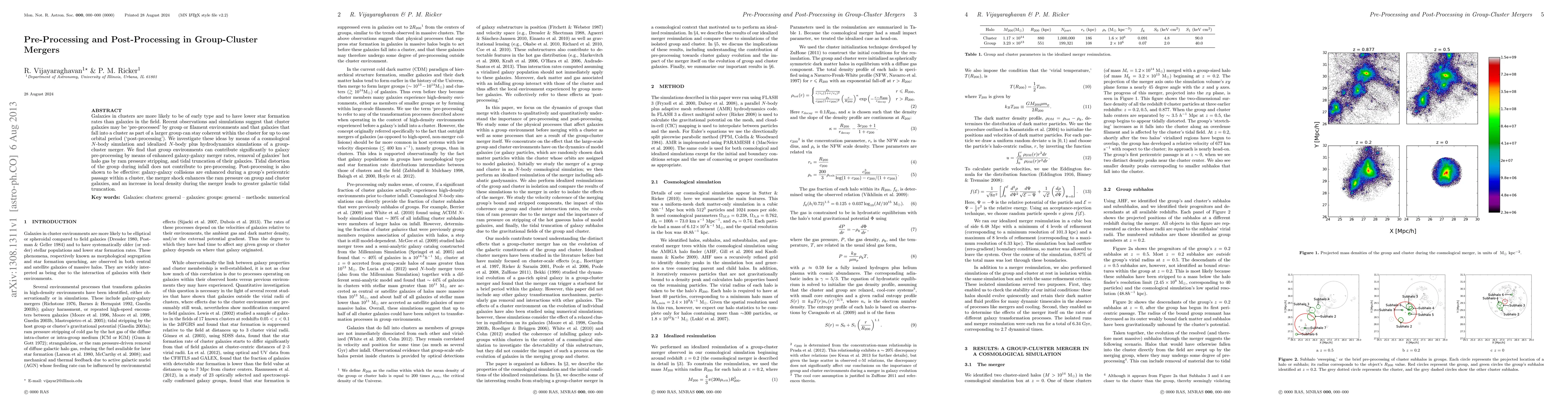 This paper investigates galaxy pre-processing and post-processing during group-cluster mergers using cosmological simulations. It finds that group environments significantly enhance pre-processing through galaxy mergers, gas stripping, and tidal truncation, while post-processing is marked by increased galaxy collisions and enhanced ram pressure during group pericentric passage within a cluster.