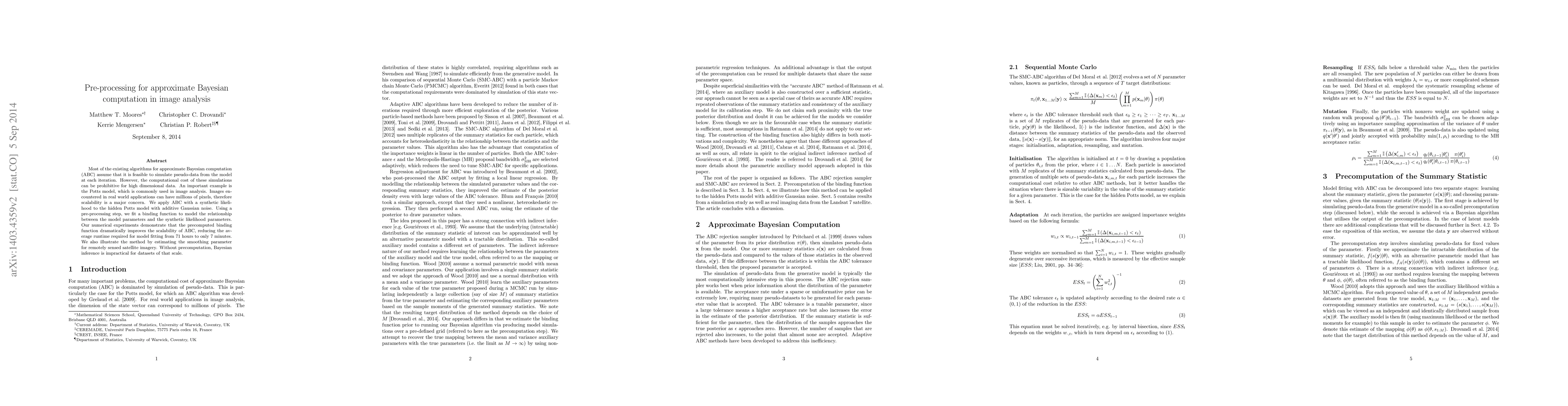This paper proposes a pre-processing method to enhance the scalability of approximate Bayesian computation (ABC) for high-dimensional data, specifically the Potts model in image analysis. By fitting a binding function to model the relationship between model parameters and synthetic likelihood parameters, the method reduces the average runtime for model fitting from 71 hours to just 7 minutes.