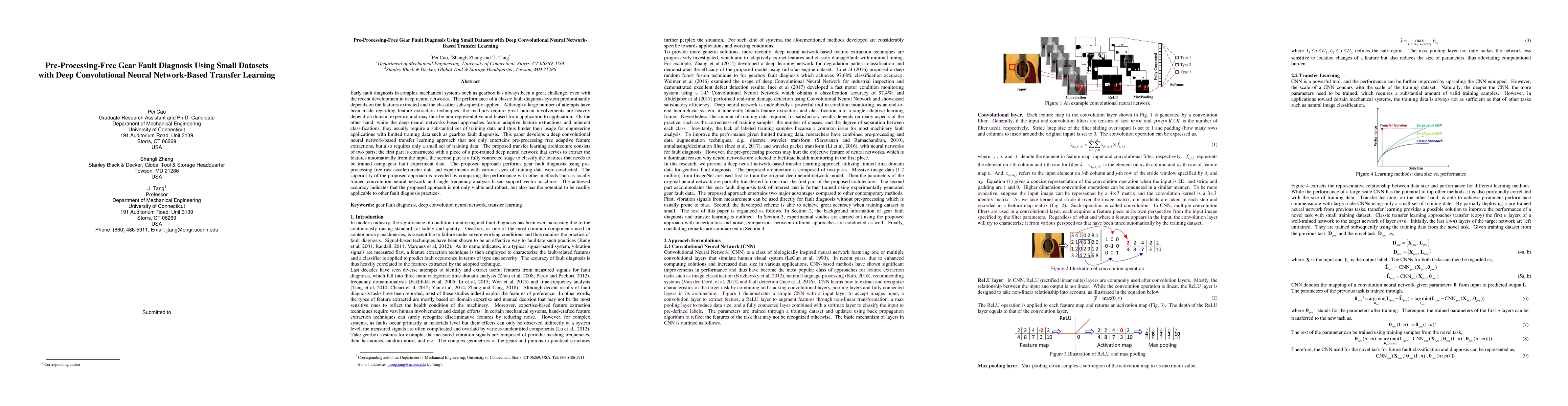 This paper proposes a deep convolutional neural network-based transfer learning method for pre-processing-free gear fault diagnosis using small datasets. The approach demonstrates high accuracy and adaptability, outperforming traditional methods reliant on extensive pre-processing or large training data.