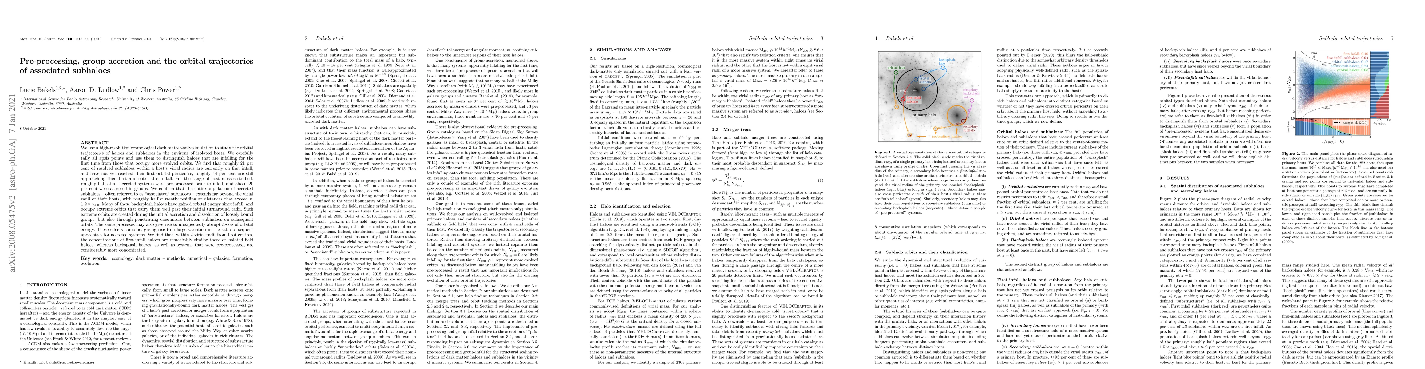 The study, using high-resolution cosmological simulations, reveals that approximately 21% of subhaloes within a host's virial radius are on their first infall, while 44% approach their first apocentre post-infall. Half of accreted systems were pre-processed before infall, and 20% were accreted in groups. Extreme orbits of backsplash haloes result from initial group accretion and dissolution or subhalo encounters, causing orbital energy variations. First-infall halo concentrations near host centers mirror isolated field halos, but pre-processed and backsplash haloes are more concentrated.
