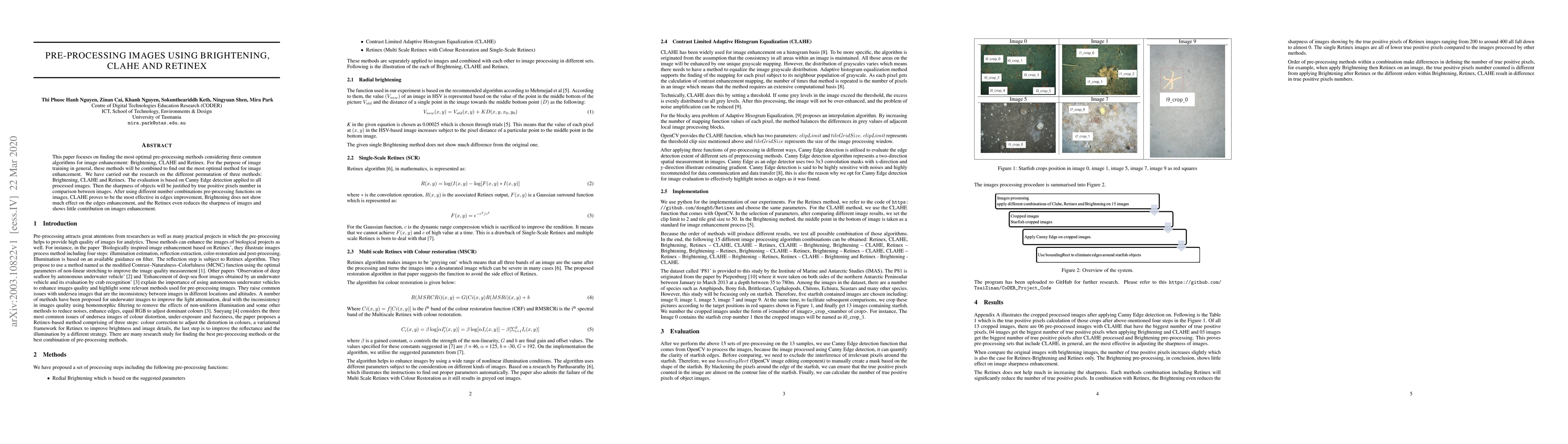 This paper focuses on finding the most optimal pre-processing methods considering three common algorithms for image enhancement: Brightening, CLAHE and Retinex. For the purpose of image training in general, these methods will be combined to find out the most optimal method for image enhancement. We have carried out the research on the different permutation of three methods: Brightening, CLAHE and Retinex. The evaluation is based on Canny Edge detection applied to all processed images. Then the sharpness of objects will be justified by true positive pixels number in comparison between images. After using different number combinations pre-processing functions on images, CLAHE proves to be the most effective in edges improvement, Brightening does not show much effect on the edges enhancement, and the Retinex even reduces the sharpness of images and shows little contribution on images enhancement.