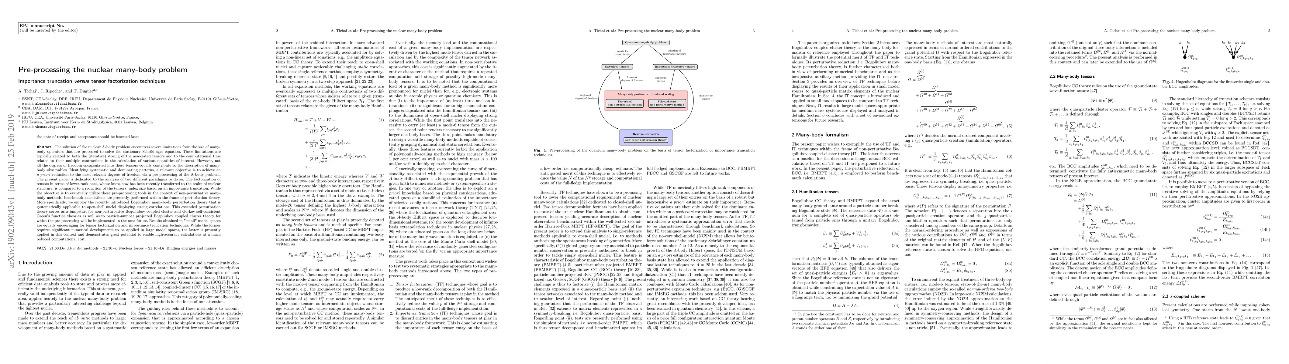 The solution of the nuclear A-body problem encounters severe limitations from the size of many-body operators. These limitations are typically related to both the (iterative) storing of the associated tensors and to the computational time related to their multiple contractions in the calculation of various quantities of interest. However, not all the degrees of freedom encapsulated into these tensors equally contribute to the description of many-body observables. Identifying systematic and dominating patterns, a relevant objective is to achieve an \emph{a priori} reduction to the most relevant degrees of freedom via a pre-processing of the A-body problem. The present paper is dedicated to the analysis of two different paradigms to do so. The factorization of tensors in terms of lower-rank ones, whose know-how has been recently transferred to the realm of nuclear structure, is compared to a reduction of the tensors' index size based on an importance truncation. While the objective is to eventually utilize these pre-processing tools in the context of non-perturbative many-body methods, benchmark calculations are presently performed within the frame of perturbation theory. More specifically, we employ the recently introduced Bogoliubov many-body perturbation theory that is systematically applicable to open-shell nuclei displaying strong correlations. This extended perturbation theory serves as a jumpstart for non-perturbative Bogoliubov coupled cluster and Gorkov self-consistent Green's function theories. Results obtained in "small" model spaces are equally encouraging for tensor factorization and importance truncation techniques. While the former requires significant numerical developments to be applied in large model spaces, the latter is presently applied in this context and demonstrates great potential to enable high-accuracy calculations at a much reduced computational cost.