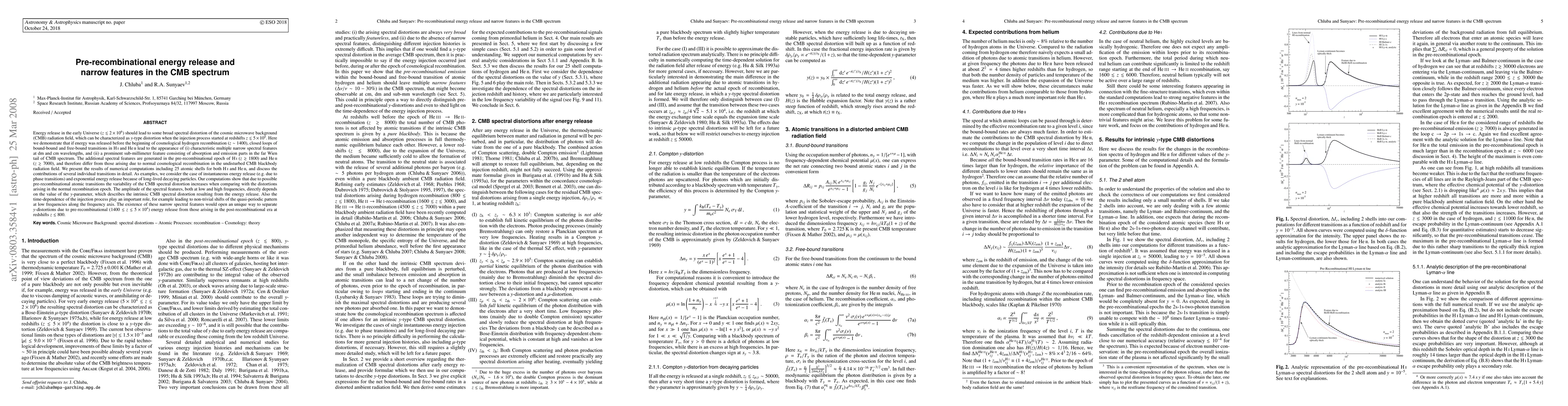 This paper investigates the impact of energy release before cosmological hydrogen recombination on the cosmic microwave background (CMB) spectrum, identifying narrow spectral features and a prominent sub-millimeter feature in the CMB's far Wien tail, which differ from those in the post-recombination era. Numerical computations show increased variability in CMB spectral distortions due to pre-recombinational atomic transitions.