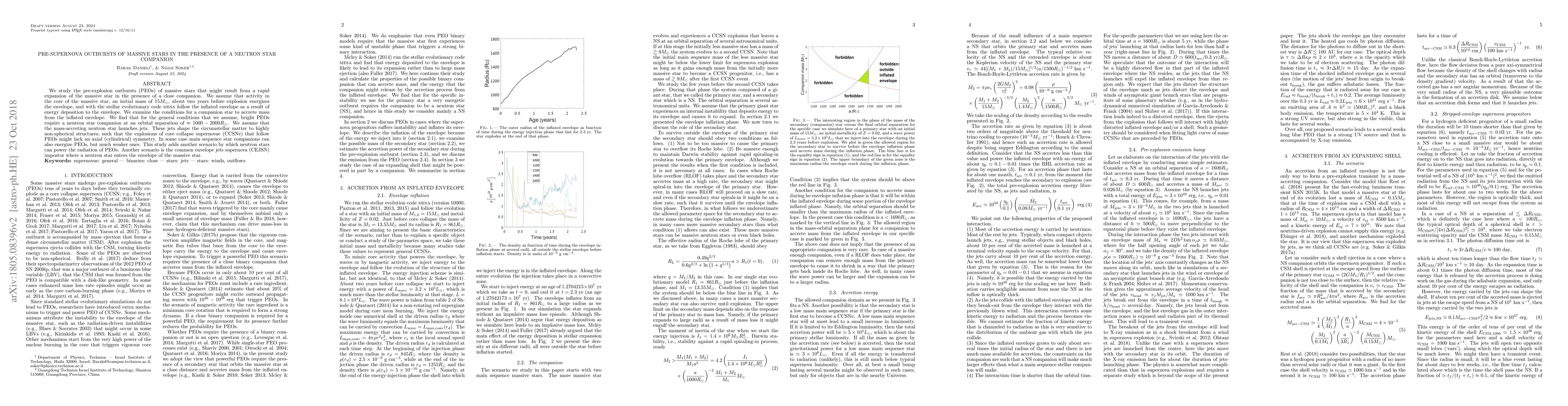 We study the pre-explosion outbursts (PEOs) of massive stars that might result from a rapid expansion of the massive star in the presence of a close companion. We assume that activity in the core of the massive star, an initial mass of 15Mo, about two years before explosion energizes the envelope, and with the stellar evolutionary code MESA follow the inflated envelope as a result of energy deposition to the envelope. We examine the conditions for a companion star to accrete mass from the inflated envelope. We find that for the general conditions that we assume, bright PEOs require a neutron star companion at an orbital separation of about 1000-2000Ro. We assume that the mass-accreting neutron star launches jets. These jets shape the circumstellar matter to highly non-spherical structures, such that the explosions of core collapse supernovae (CCSNe) that follow PEOs might lack an axial (cylindrical) symmetry. In some case main sequence star companions can also energize PEOs, but much weaker ones. This study adds another scenario by which neutron stars can power the radiation of PEOs. Another scenario is the common envelope jets supernova (CEJSN) impostor where a neutron star enters the envelope of the massive star.