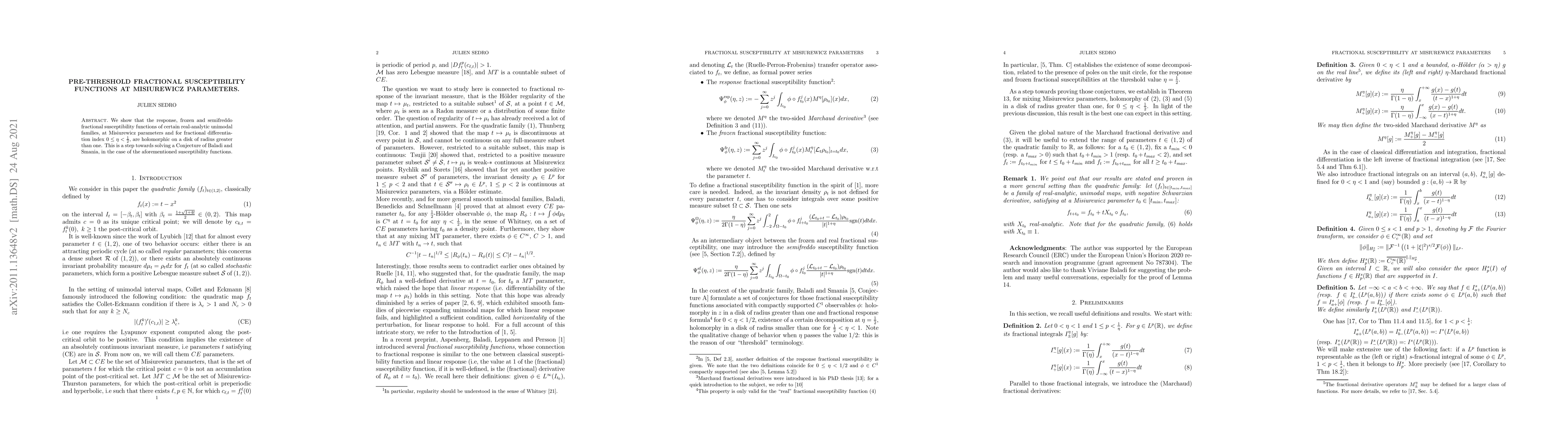 Researchers have shown that certain real-analytic unimodal families of susceptibility functions remain holomorphic on a disk greater than one when evaluated at Misiurewicz parameters for fractional differentiation indices between 0 and 1/2.