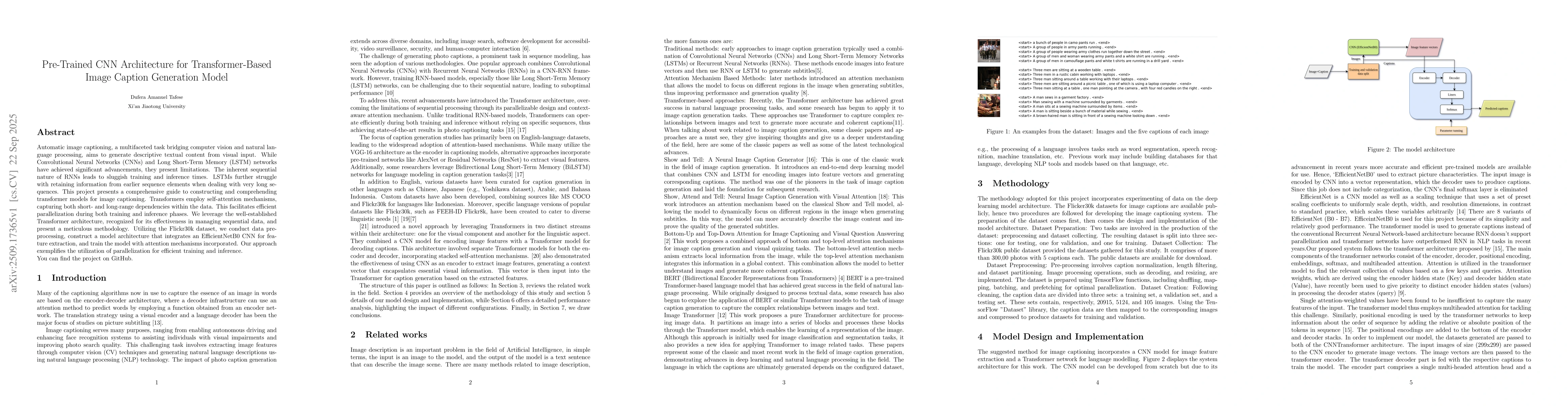 The technical contribution includes the integration of a pre-trained EfficientNetB0 CNN with a transformer architecture, incorporating multi-head attention and positional encoding for enhanced image captioning.