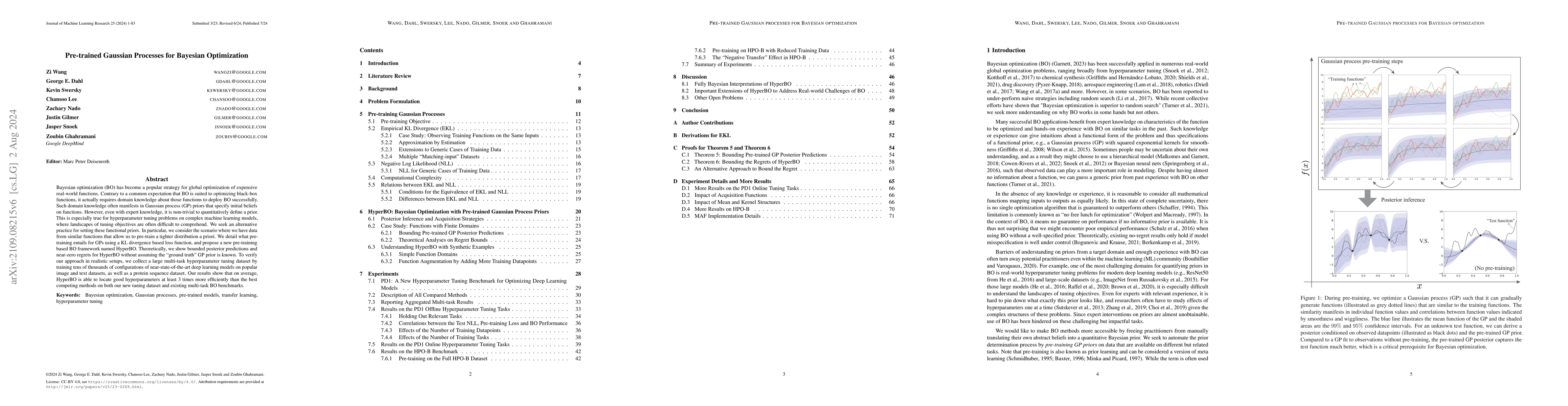 This paper proposes HyperBO, a pre-training based Bayesian optimization framework for hyperparameter tuning, using Gaussian processes pre-trained with KL divergence. It demonstrates HyperBO's efficiency in locating optimal hyperparameters, outperforming competing methods by at least three times on both new and classic multi-task benchmarks.