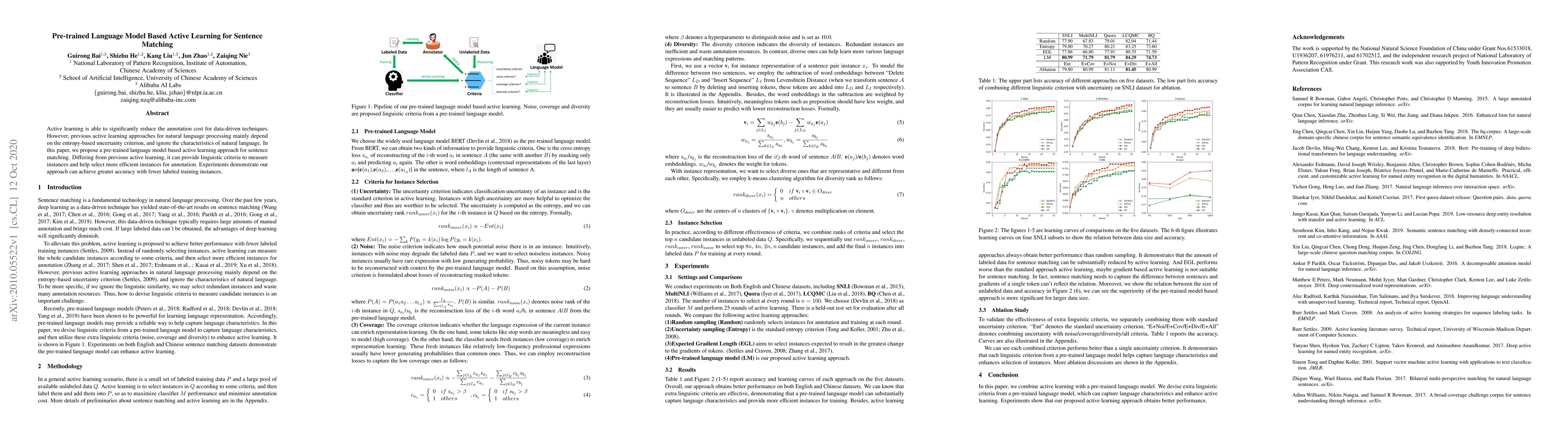 This paper proposes an active learning method for sentence matching that utilizes a pre-trained language model to incorporate linguistic criteria, improving the selection of efficient instances for annotation over traditional entropy-based methods. The results show increased accuracy with fewer labeled training instances.