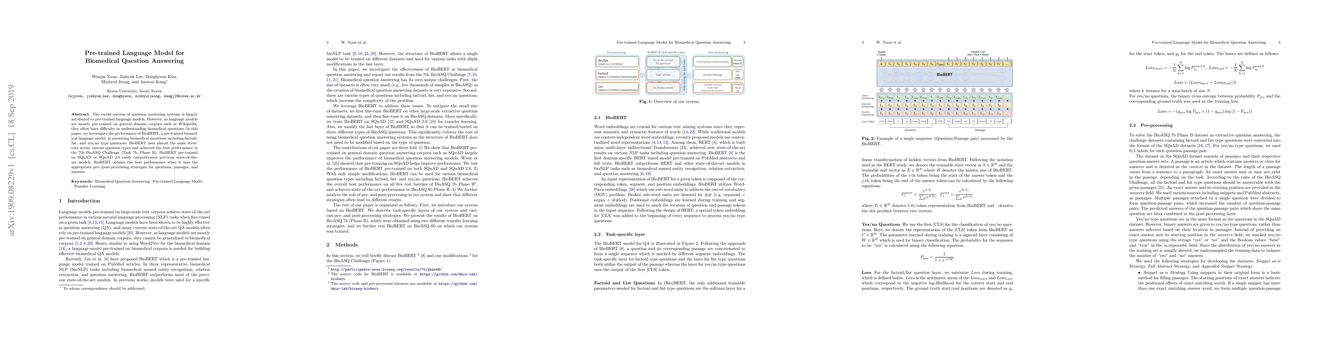 The recent success of question answering systems is largely attributed to pre-trained language models. However, as language models are mostly pre-trained on general domain corpora such as Wikipedia, they often have difficulty in understanding biomedical questions. In this paper, we investigate the performance of BioBERT, a pre-trained biomedical language model, in answering biomedical questions including factoid, list, and yes/no type questions. BioBERT uses almost the same structure across various question types and achieved the best performance in the 7th BioASQ Challenge (Task 7b, Phase B). BioBERT pre-trained on SQuAD or SQuAD 2.0 easily outperformed previous state-of-the-art models. BioBERT obtains the best performance when it uses the appropriate pre-/post-processing strategies for questions, passages, and answers.